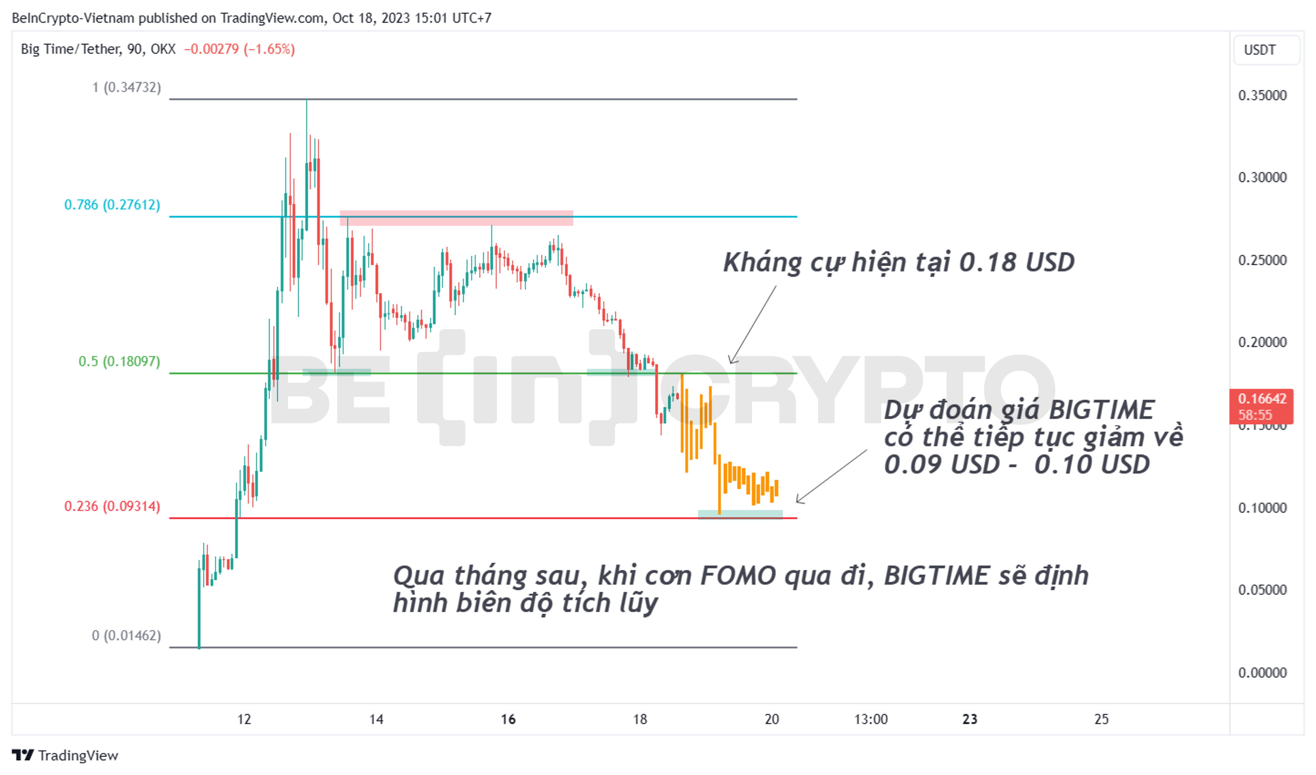 - Giá chưa thể áp dụng các chỉ báo kỹ thuật trung bình vì dữ liệu giá trên sàn vẫn quá ít. Nhưng Fibonacci cho thấy các kháng cự và hỗ trợ quan trọng của BIGTIME đã được định hình rõ nét. Cụ thể, kháng cự gần tại Fibo 0.5 tương đương vùng 0.18 USD, và hỗ trợ trước mắt tại Fibo 0.236 tương đương 0.09 USD.