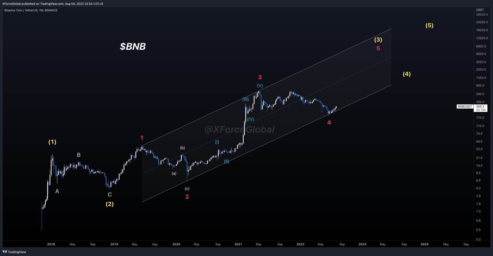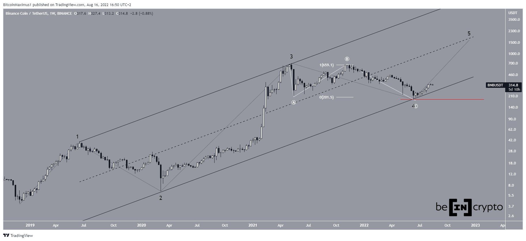 Số lượng sóng dài hạn có khả năng xảy ra nhất chỉ ra rằng BNB vừa bắt đầu làn sóng thứ năm và cũng là sóng cuối cùng của một xu hướng tăng bắt đầu vào tháng 12 năm 2018.
