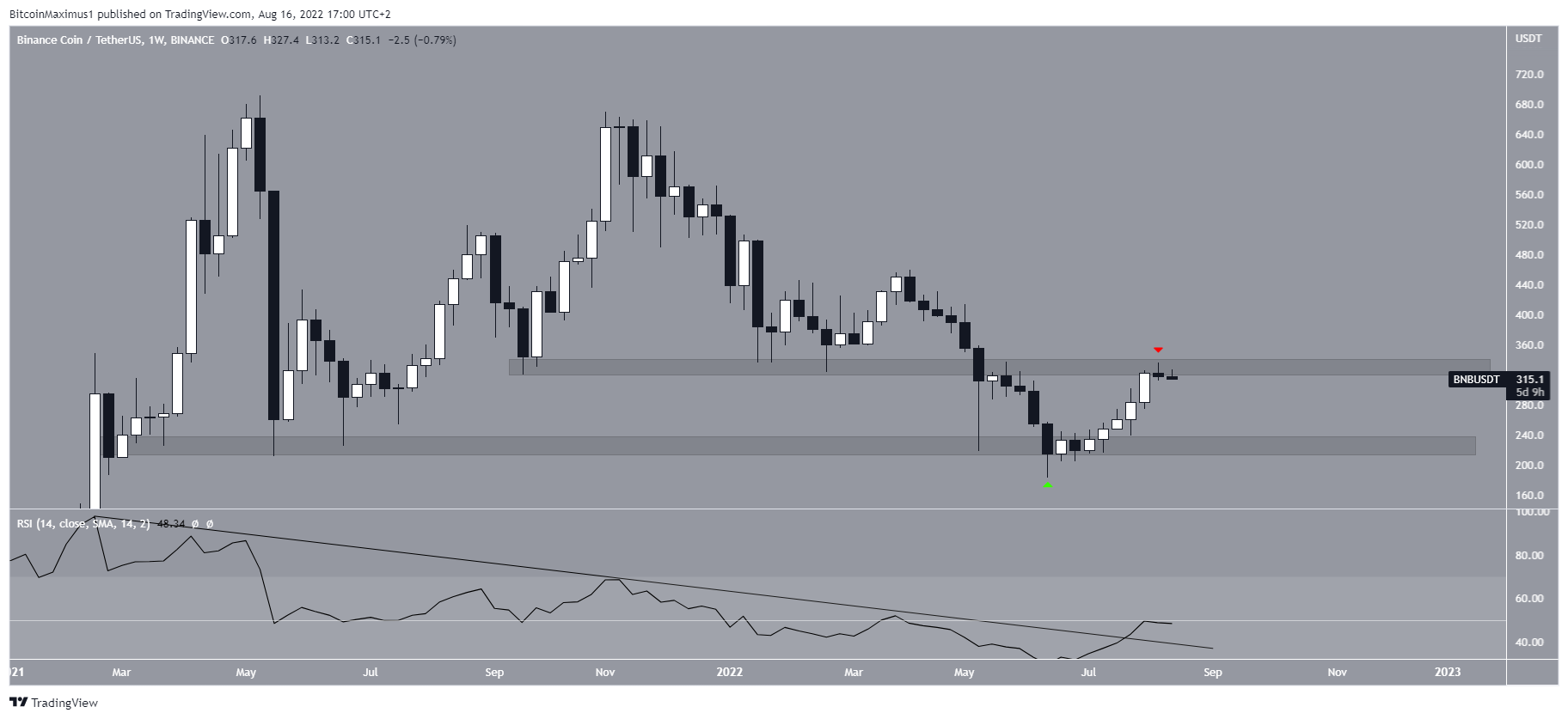Binance Coin hầu như đã giảm kể từ khi đạt mức cao nhất mọi thời đại là 691.80 USD vào tháng 5 năm 2021. Nó đã tạo ra đỉnh thấp hơn vào tháng 11 năm 2021 và tiếp tục giảm xuống mức thấp nhất vào tháng 6 năm 2022 tại 183 USD. Giá đã tăng kể từ đó trong một động thái xác nhận khu vực 225 USD là mức hỗ trợ (biểu tượng màu xanh lá cây).
