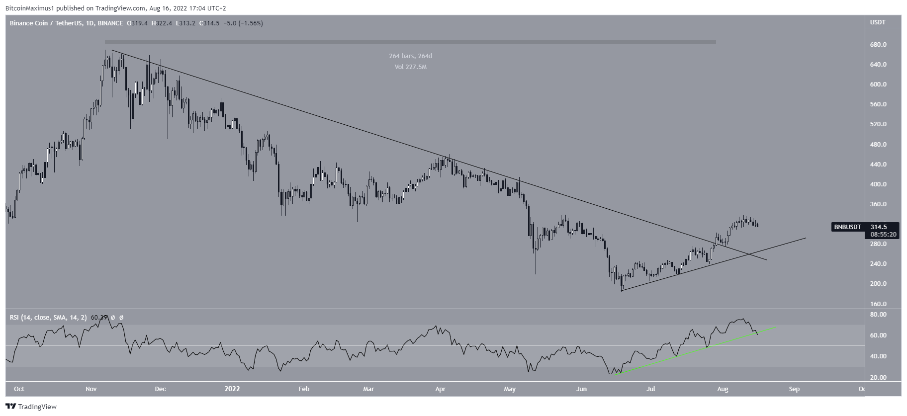 Biểu đồ hàng ngày cũng cho thấy triển vọng tăng giá, phù hợp với các dấu hiệu quan sát được từ biểu đồ hàng tuần. Vào ngày 29 tháng 7, BNB đã bứt phá khỏi đường kháng cự giảm dần đã tồn tại trong 264 ngày. Tuy nhiên, đường xu hướng tăng dần của RSI (đường màu xanh lá cây) đi kèm với sự bứt phá hiện đã bị phá vỡ. Do đó, có thể giá sẽ giảm về phía đường hỗ trợ tăng dần đã có từ ngày 18 tháng 6. Đường này hiện được tìm thấy ở mức 275 USD, sau đó xu hướng tăng sẽ tiếp tục.