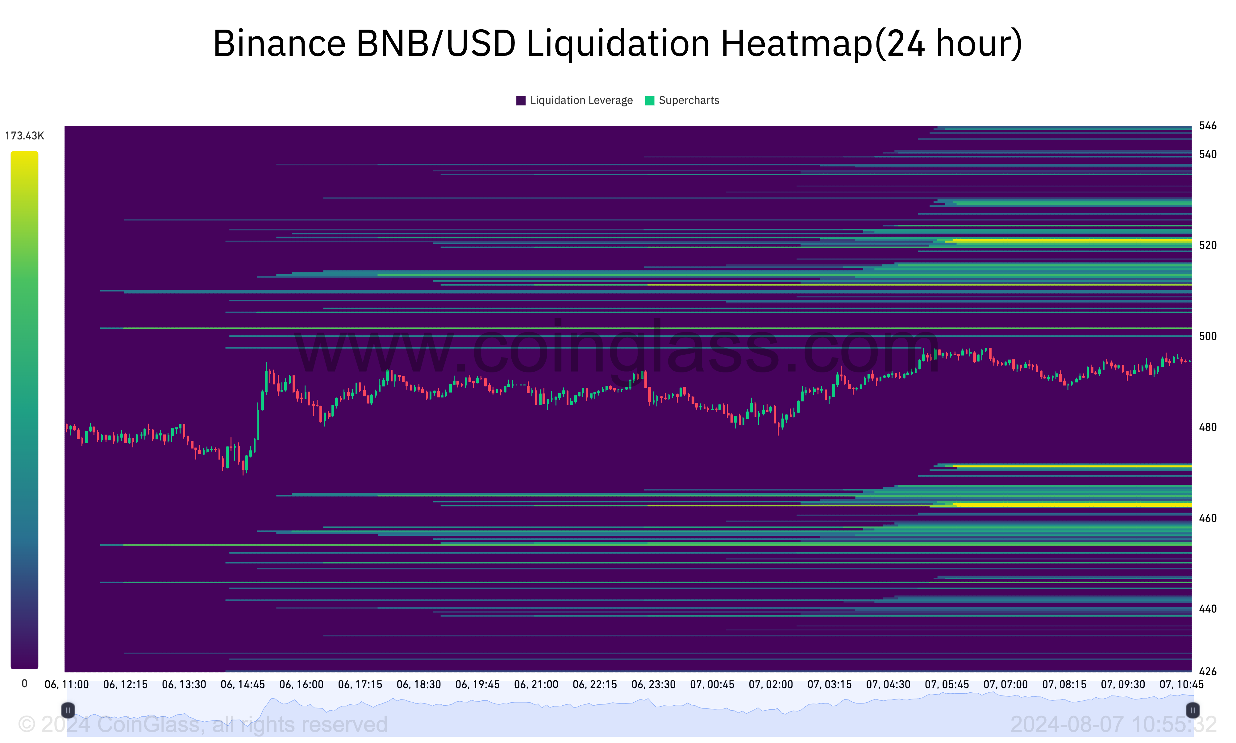 Theo bản đồ nhiệt thanh lý, một lượng lớn thanh khoản được tập trung ở mức 520.65 USD, và một lượng khác ở mức 463.23 USD. Nói một cách đơn giản, bản đồ nhiệt chỉ ra các mức giá nơi có thể xảy ra thanh lý quy mô lớn. Khi thanh khoản gia nhập một phạm vi giá, màu sắc thay đổi từ tím sang vàng. Thông thường, khi có thanh khoản cao ở một mức độ, giá cả có xu hướng di chuyển theo hướng đó, hoặc làm hỗ trợ hoặc làm kháng cự.