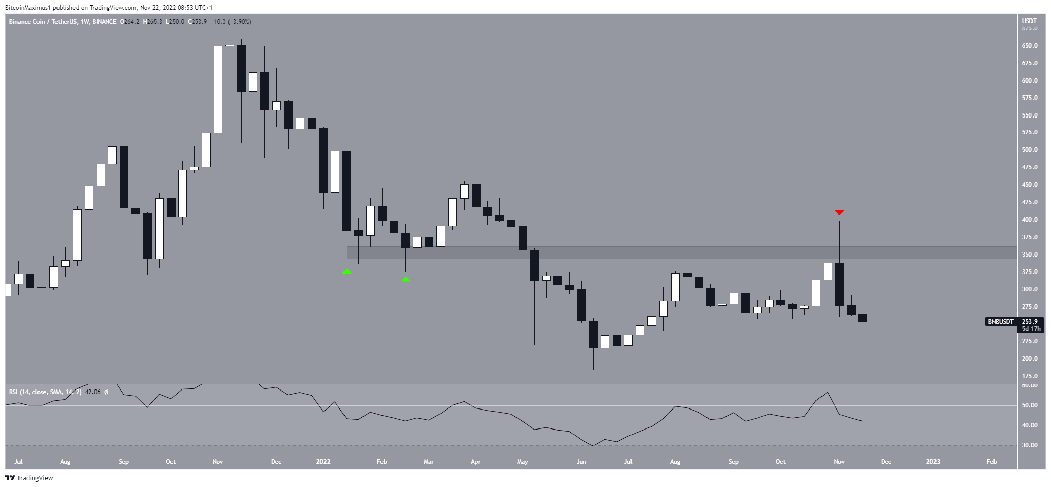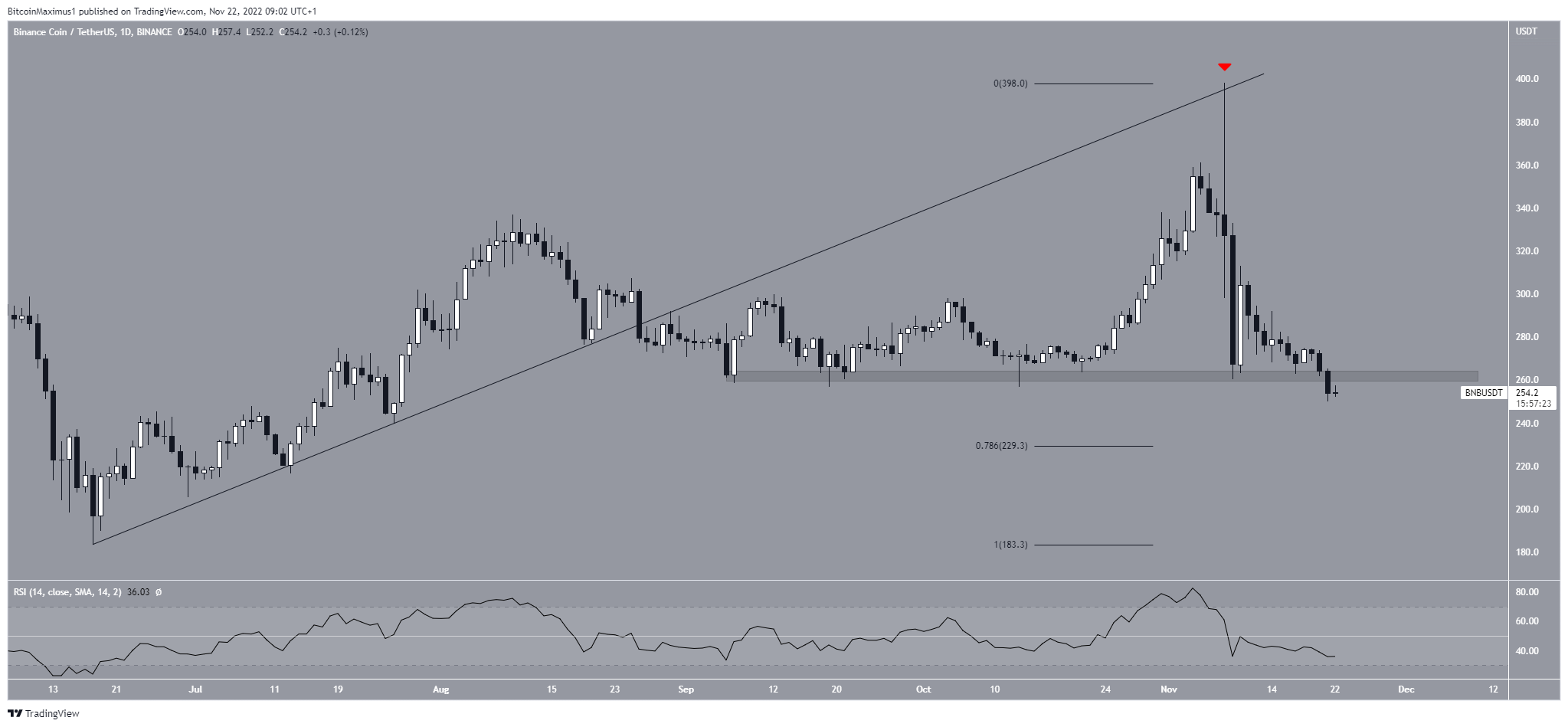 Phân tích kỹ thuật từ biểu đồ hàng ngày cho thấy BNB đã phá vỡ khỏi đường hỗ trợ tăng dần vào ngày 27/8. Trong khi giá BNB tăng đáng kể sau đó thì nó đã xác nhận đường này là kháng cự vào ngày 08/11 (biểu tượng màu đỏ). Điều này tạo ra một bấc nến dài phía trên và bắt đầu sự sụt giảm mà chúng ta thấy hiện tại.