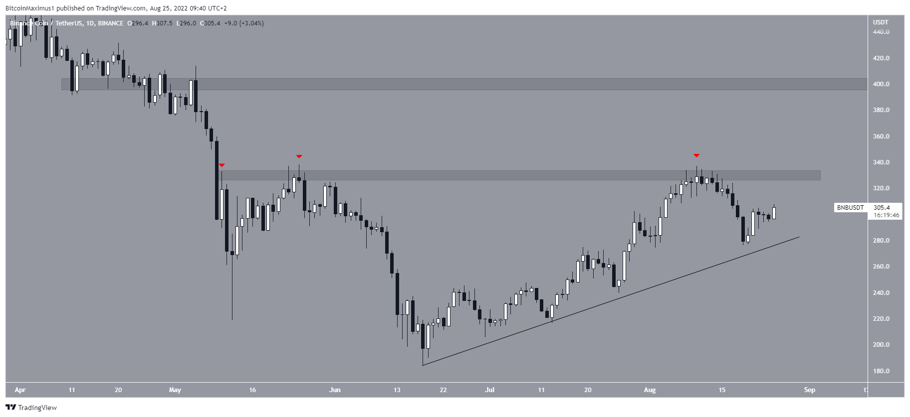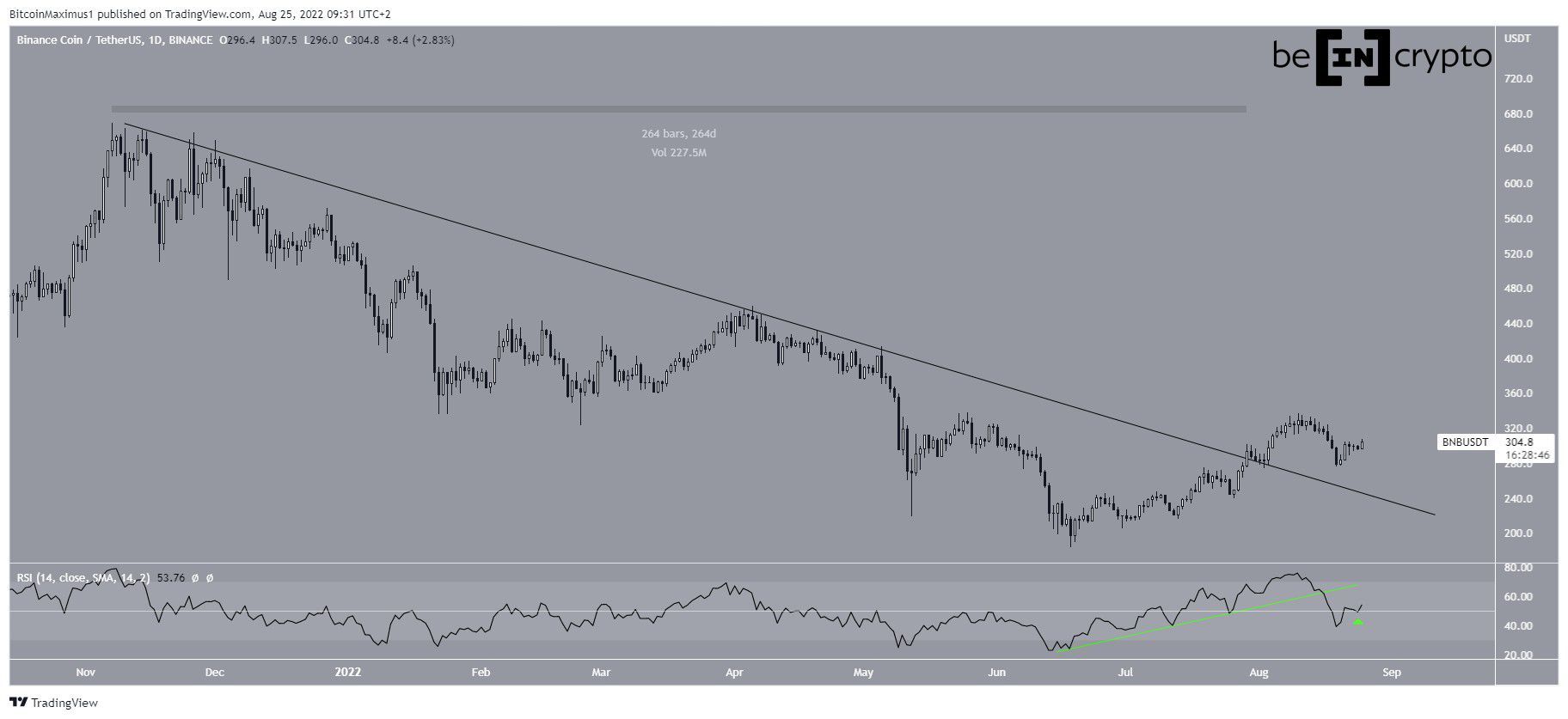 Binance Coin (BNB) đã tăng lên kể từ khi đạt mức thấp nhất là 184.40 USD vào ngày 18 tháng 6. Sự chuyển động đi lên đã gây ra sự bứt phá khỏi đường kháng cự giảm dần vào ngày 29 tháng 7. Tại thời điểm đột phá, đường này đã kéo dài trong 264 ngày.