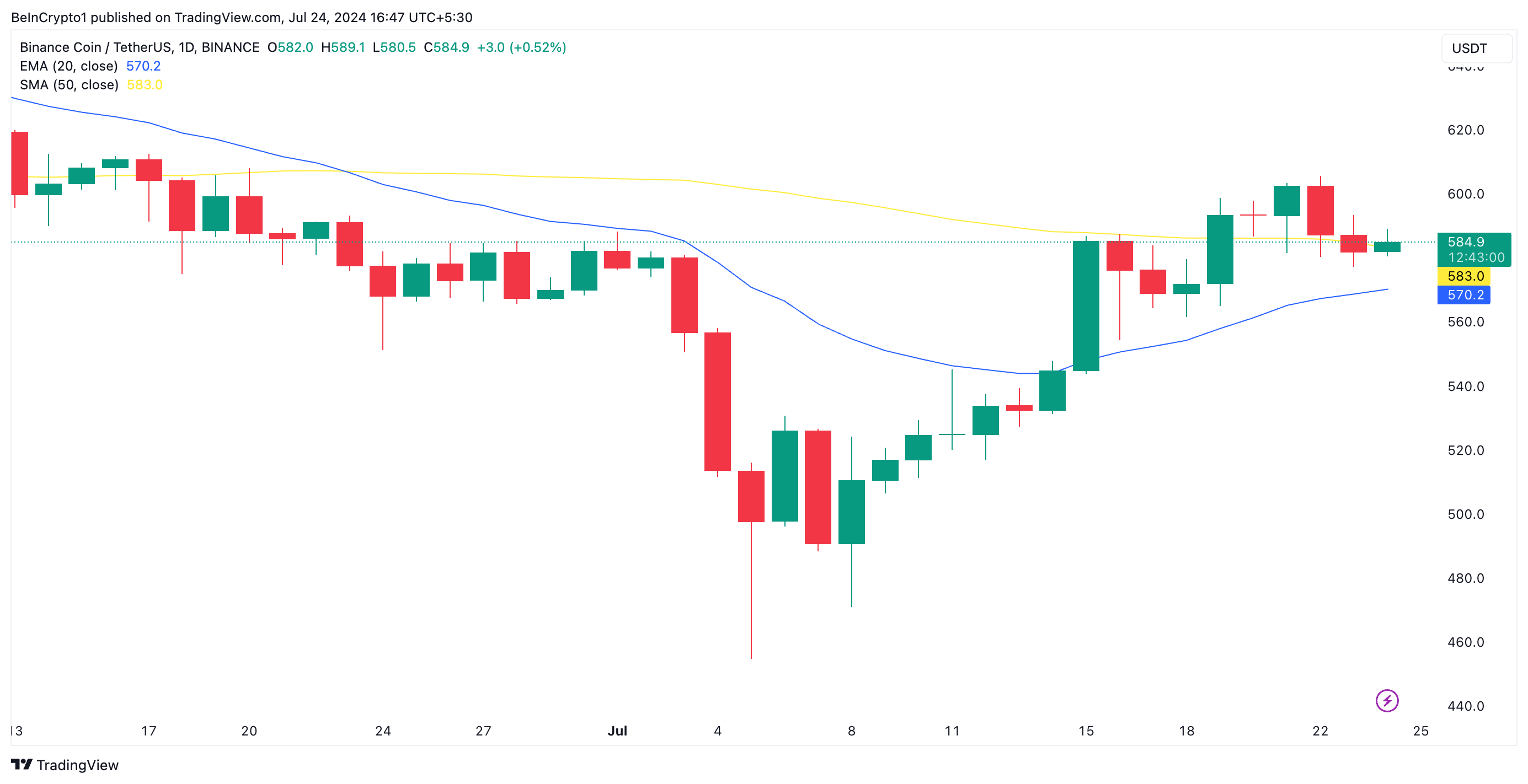 Tại thời điểm viết bài, BNB giao dịch quanh mức SMA 50 ngày và đang trong xu hướng giảm, cố gắng giảm xuống dưới mức EMA 20 ngày. Khi giá của một tài sản được thiết lập theo cách này, nó cho thấy động lực gần đây của nó yếu hơn so với xu hướng dài hạn. Điều này báo hiệu một sự đảo ngược xu hướng tiềm năng từ tăng sang giảm, và các nhà giao dịch thường diễn giải điều này là một dấu hiệu để bán khống.