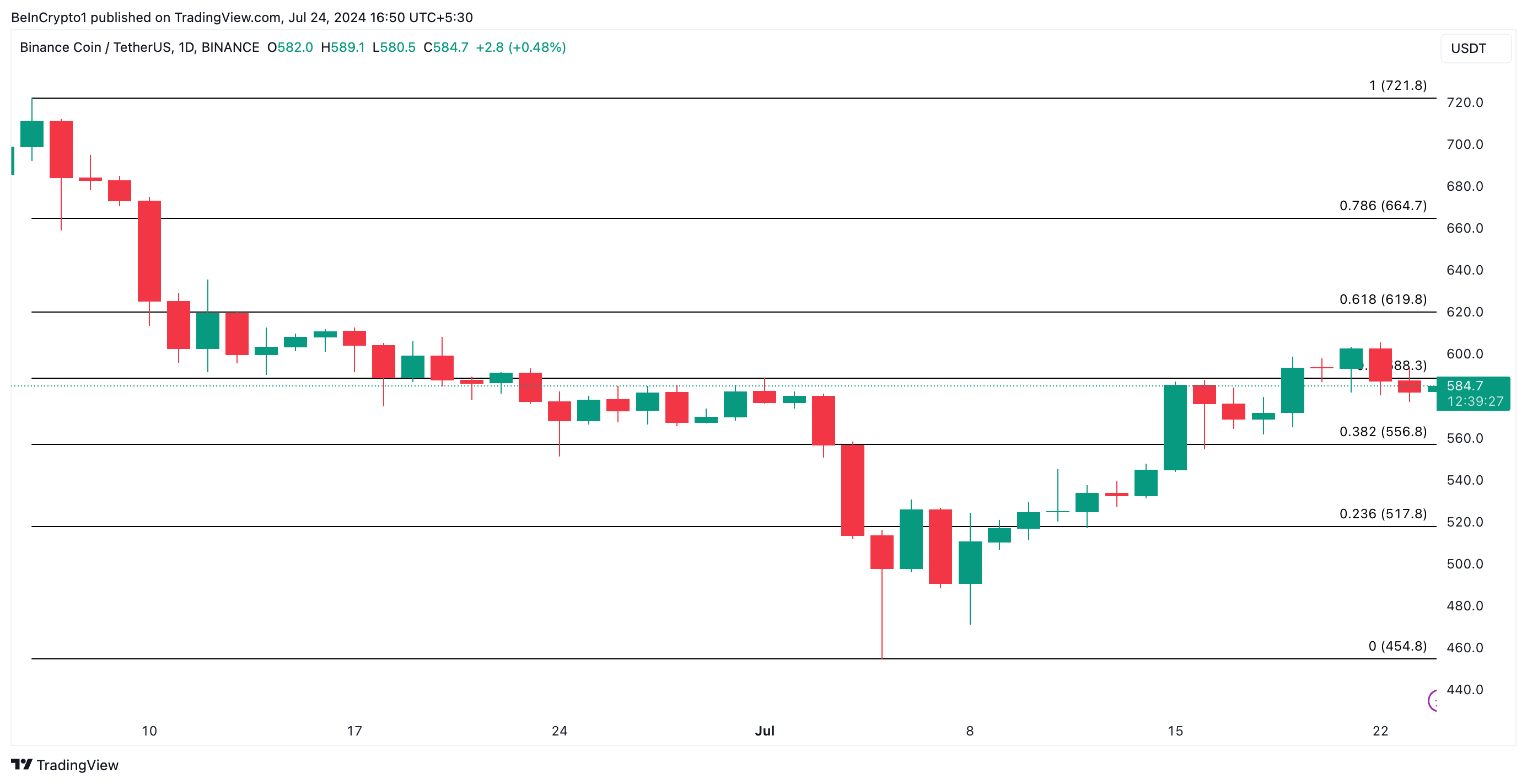 Các chỉ số MACD và CMF của BNB cho thấy động lực tăng, ám chỉ rằng giá của tài sản có khả năng tăng. Tuy nhiên, việc giá của nó đang ở mức SMA 50 ngày và tiến gần đến EMA 20 ngày cho thấy áp lực giảm tiềm năng. Nếu các tín hiệu giảm từ các trung bình động của BNB lấn át các tín hiệu tăng từ MACD và CMF của nó, một sự suy giảm giá có thể xảy ra. Giá trị của đồng tiền có thể giảm xuống 556 USD.
