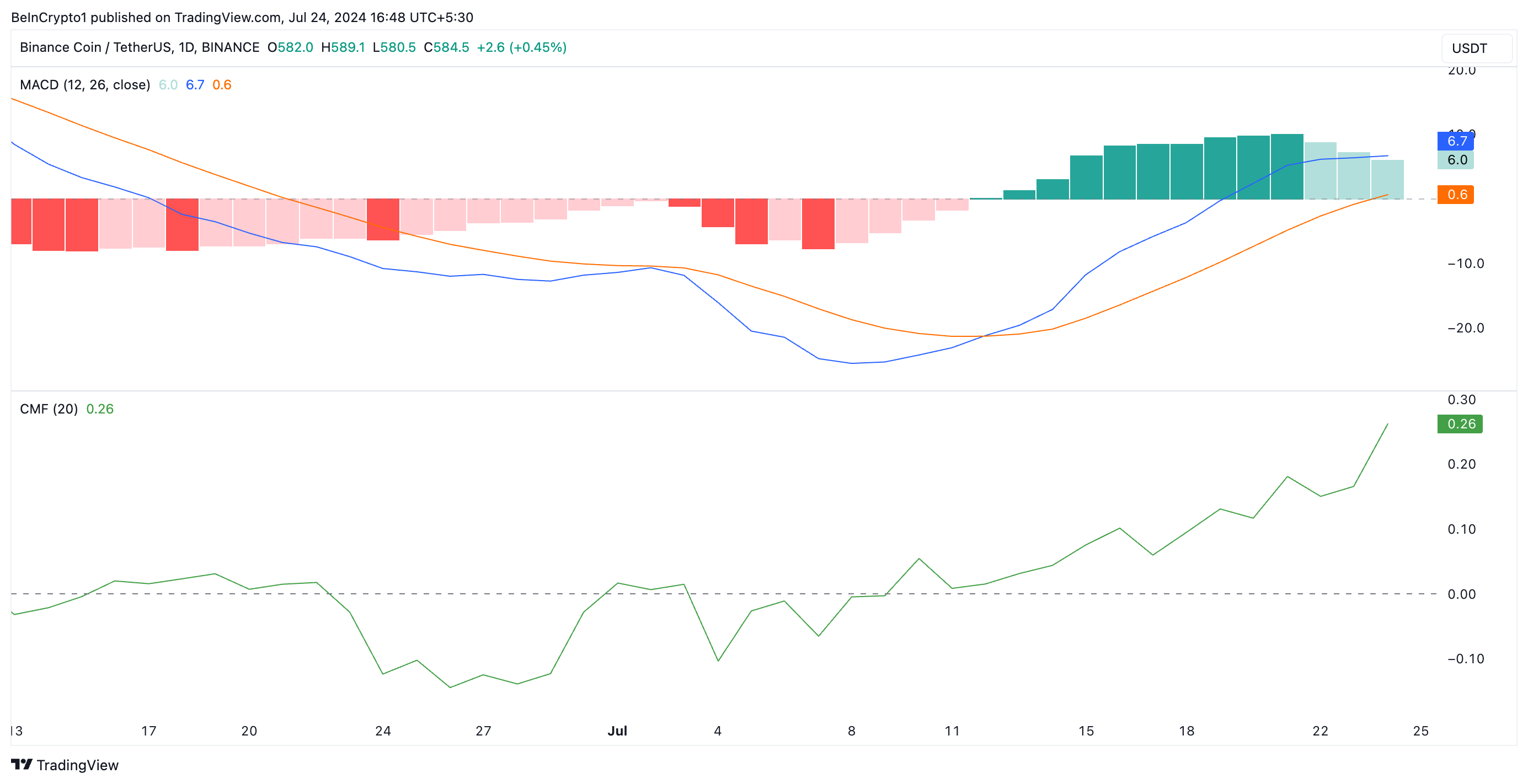 Xác nhận sức mạnh của xu hướng lạc quan đối với BNB, chỉ số CMF của nó đang trong xu hướng tăng ở mức 0.26. Chỉ báo này đo lường dòng tiền vào và ra khỏi một tài sản. Khi giá trị của nó dương, nó báo hiệu dòng tiền vào thị trường. Đây là một dấu hiệu tích cực và ám chỉ một cuộc tăng giá có thể xảy ra.