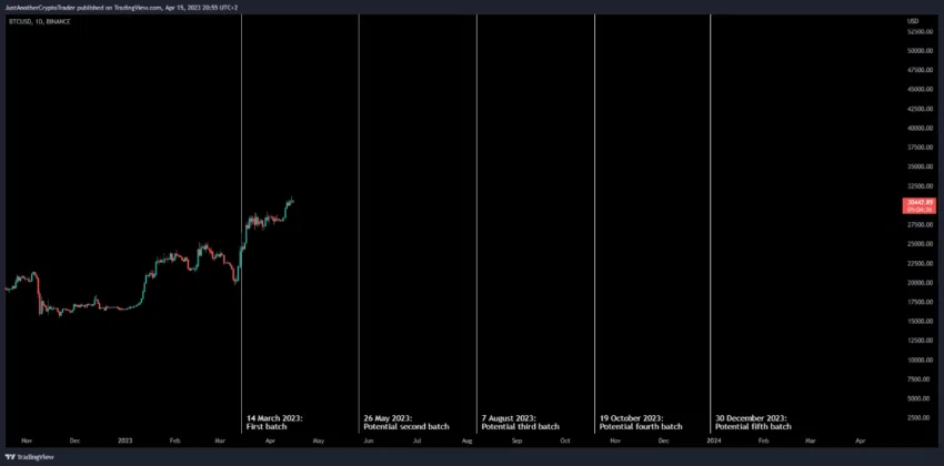 Tổng cộng, Chính phủ Hoa Kỳ có kế hoạch bán 41,500 BTC ra thị trường trong năm nay. Một nhà phân tích tại CryptoQuant đã cung cấp thời điểm chính xác mà Chính phủ dự kiến sẽ bán 4 phần còn lại bao gồm ngày 26/5; 07/8; 19/10 và 30/12. Hãy đánh dấu những ngày này vào trong lịch của bạn, vì khi đó thị trường có thể biến động mạnh.