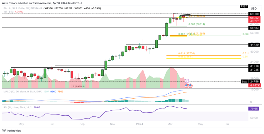 Sau khi đạt mức thấp cục bộ ở mức khoảng 64,500 USD, BTC đã trải qua một đợt tăng giá đáng kể, dẫn đến mức tăng khoảng 12.7%. Tuy nhiên, kể từ ngày hôm qua, giá BTC đã tăng trở lại, đưa nó trở lại tỷ lệ vàng ở mức khoảng 68,850 USD. Ở mức này, BTC có thể tìm thấy hỗ trợ và có khả năng bật lên. Nếu giá phá vỡ dưới mức Fibonacci này theo cách giảm, các hỗ trợ Fibonacci quan trọng tiếp theo dự kiến sẽ vào khoảng 60,314 USD và 51,900 USD.