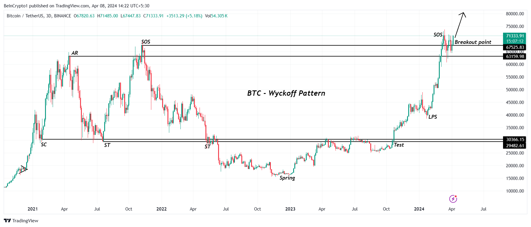 Đây là một dấu hiệu cho thấy những người nắm giữ BTC đang mong đợi giá tăng hơn nữa. Trên biểu đồ 3 ngày, Bitcoin đang xác nhận mô hình Wyckoff, một khái niệm phân tích kỹ thuật xác định xu hướng và khả năng đảo chiều trên thị trường tài chính. Nó phân tích biến động giá và khối lượng để phân biệt các giai đoạn tích lũy, phân phối hoặc đánh dấu.