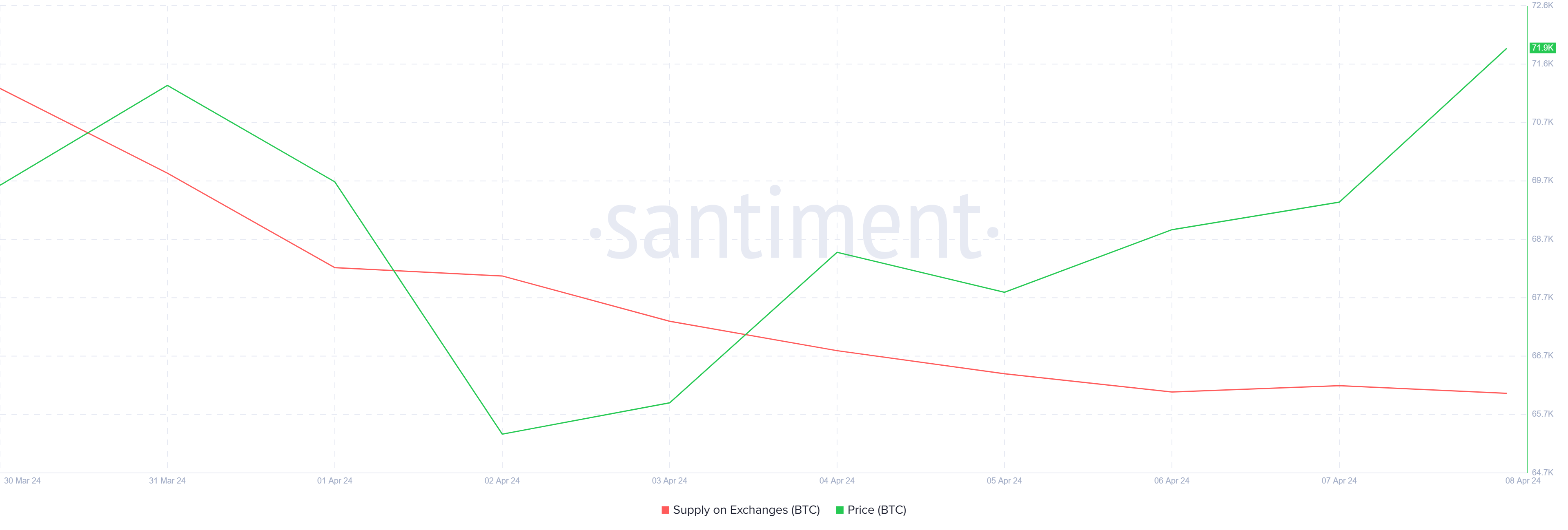 Giá Bitcoin đã và đang tận hưởng sự tăng giá bắt nguồn từ sự tích lũy nhất quán được ghi nhận bởi các nhà đầu tư. Chỉ trong tuần qua, tổng nguồn cung của tất cả các sàn giao dịch đã giảm từ 812,000 BTC xuống còn 799,000 BTC. Điều này cho thấy gần 13,000 BTC trị giá hơn 926 triệu USD đã chuyển từ sàn giao dịch sang ví của các nhà đầu tư.