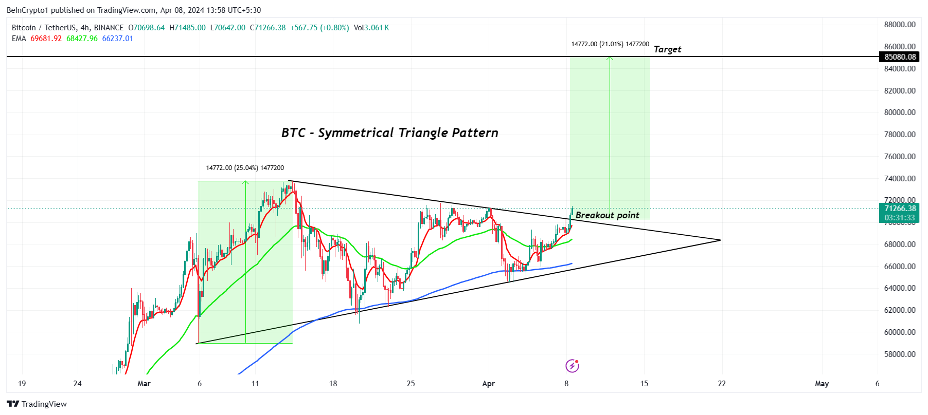 Mặc dù mục tiêu dài hạn khá khó xác định do các yếu tố chưa từng có, không thể giải thích được, nhưng có vẻ như mục tiêu ngắn hạn cho giá Bitcoin sẽ là 85,000 USD. Điều này được rút ra từ mô hình giao dịch tam giác đối xứng mà BTC đang quan sát vào lúc này.