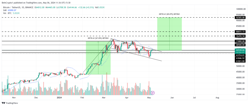 Giá giao dịch của Bitcoin ở mức 64,140 USD tại thời điểm viết bài, kiểm tra giới hạn trên mà tiền điện tử đã bị mắc kẹt kể từ tháng Ba. Mô hình tiếp tục tăng giá này cho thấy tiềm năng của một xu hướng tăng đến 45%, đặt mục tiêu ở mức 92,505 USD. Tuy nhiên, thực tế hơn, mục tiêu đang phá vỡ mức cao nhất mọi thời đại hiện tại là 73,000 USD. Điều này sẽ diễn ra khi mốc 65,000 USD được bảo đảm dưới dạng mức sàn hỗ trợ và BTC thoát ra khỏi mô hình.