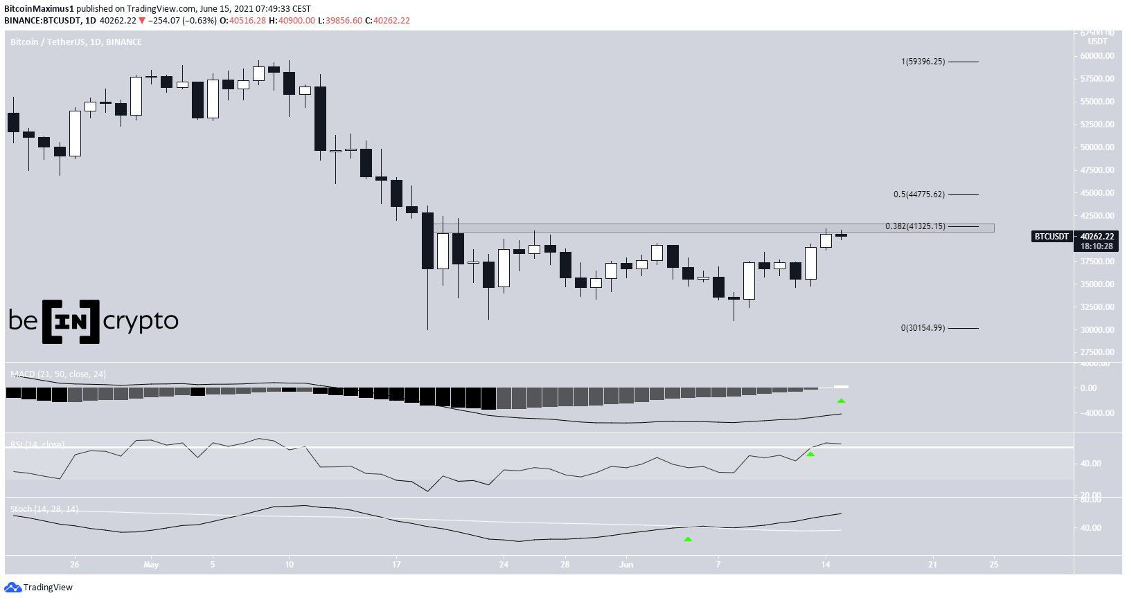 Biểu đồ khung ngày (D1) cho thấy triển vọng tăng giá của BTC. Đường giá đã liên tiếp xuất hiện hai cây nến nhấn chìm tăng vào ngày 13 và 14 tháng 6. Cho đến nay, BTC đã đạt được mức cao $41,100.
