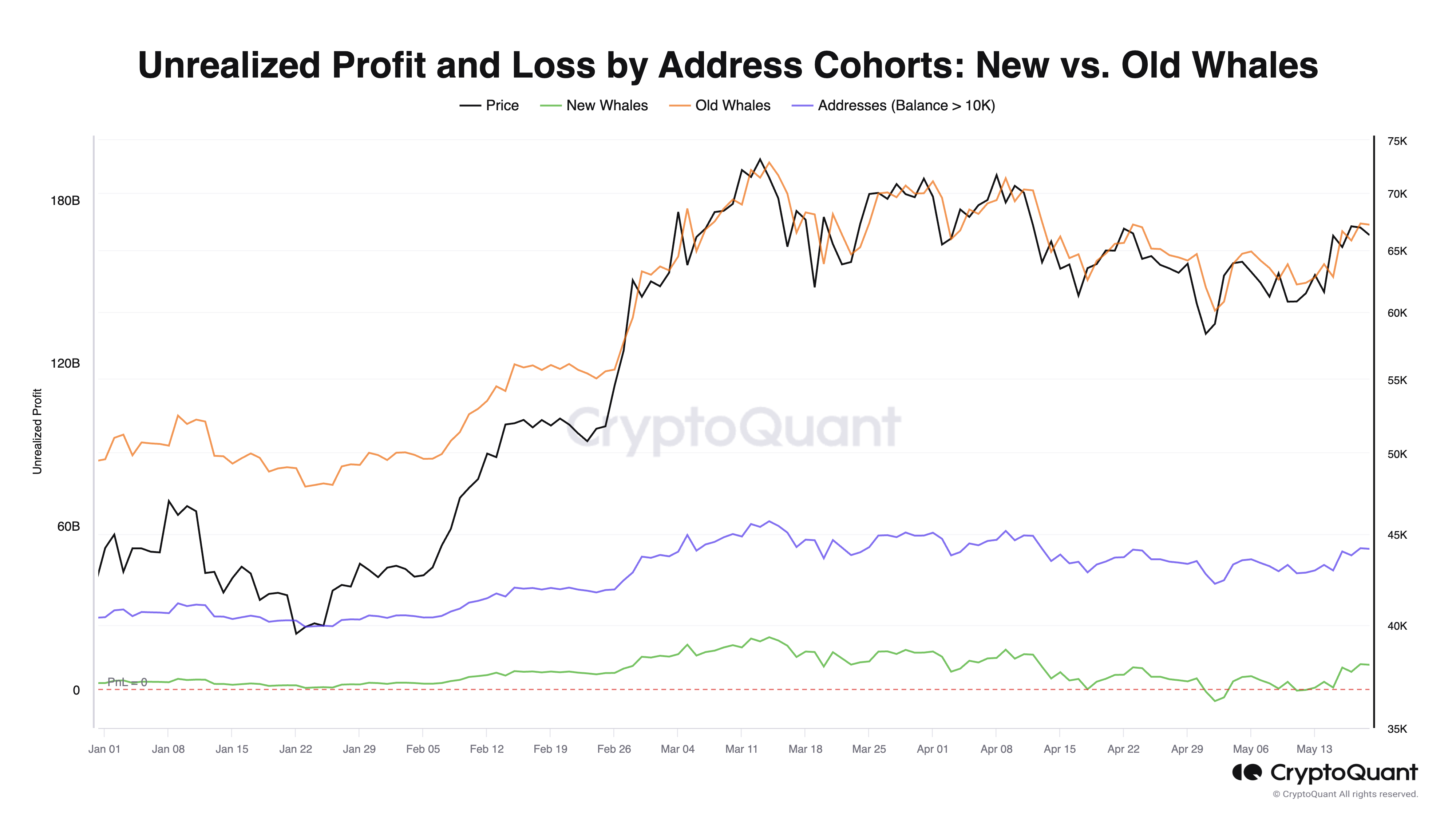 Lợi nhuận và thua lỗ chưa thực hiện (Unrealized profit and loss) phản ánh lợi nhuận hoặc thua lỗ tiềm năng nếu chủ sở hữu bán BTC của họ theo giá thị trường hiện tại. Các biểu đồ này minh họa lợi nhuận và thua lỗ chưa thực hiện của các nhóm địa chỉ Bitcoin khác nhau: cá voi mới, cá voi cũ và địa chỉ có số dư trên 10,000 BTC.