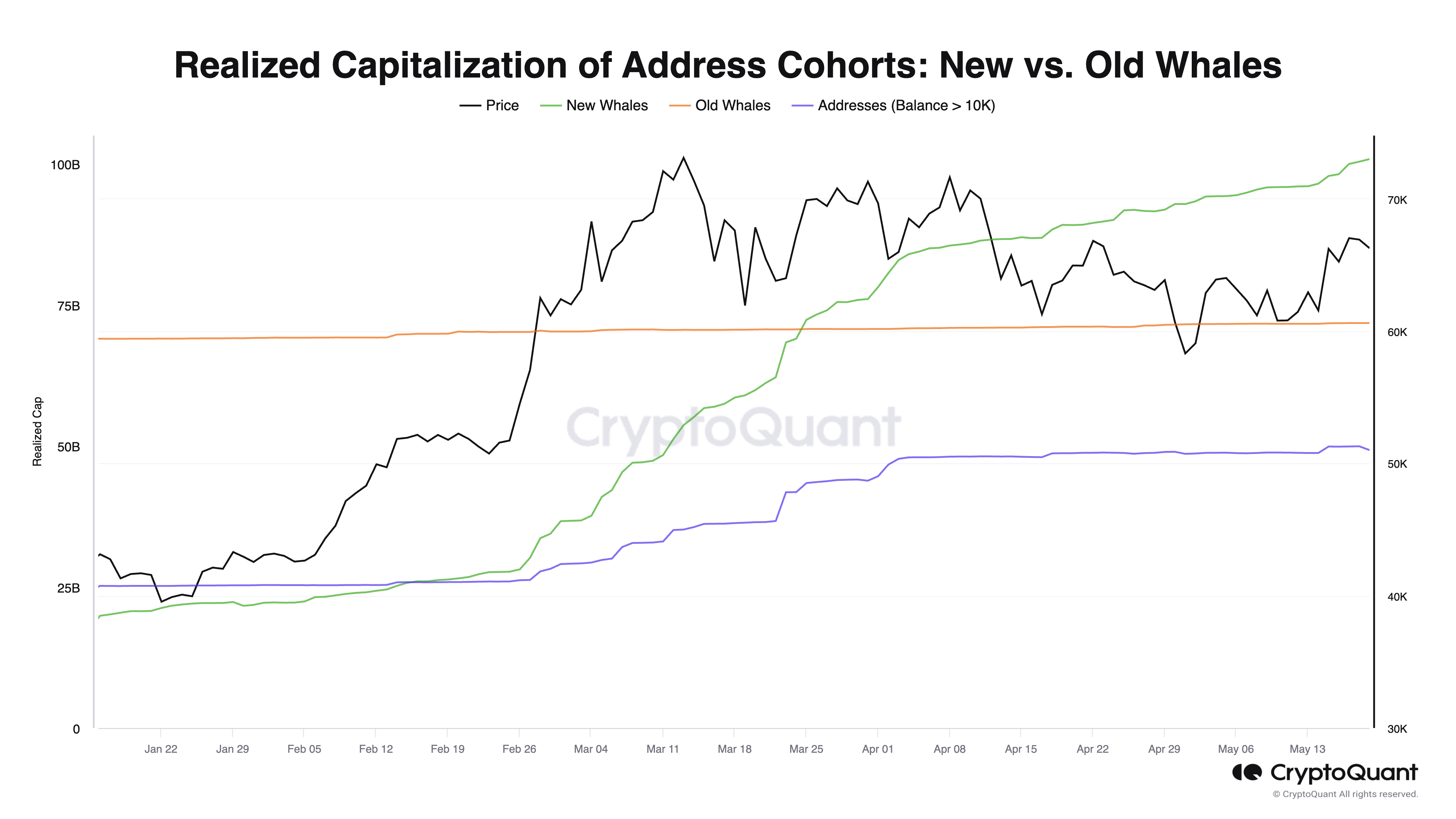 Kể từ tháng Giêng, realized cap cho cá voi mới đã tăng đều đặn, cho thấy sự tích lũy tích cực BTC bởi các nhà đầu tư lớn mới. Ngược lại, realized cap cho cá voi già vẫn tương đối ổn định, cho thấy các nhà đầu tư dài hạn nắm giữ Bitcoin của họ. Sự tăng trưởng dần dần trong realized cap cho các địa chỉ nắm giữ hơn 10,000 BTC phản ánh sự tích lũy chậm nhưng ổn định của những người nắm giữ Bitcoin lớn nhất. Điều này chỉ ra rằng ngay cả những nhà đầu tư lớn nhất cũng đang dần tăng vị thế Bitcoin của họ.