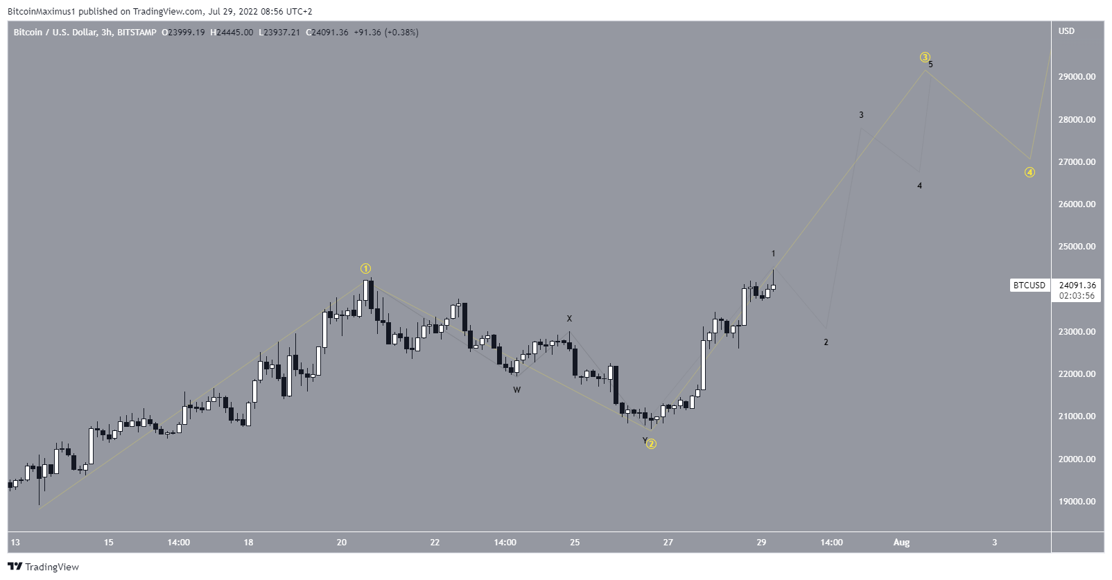 Số lượng sóng trong khung ngắn hạn có khả năng xảy ra nhất cho thấy BTC đã bắt đầu sóng ba trong số năm sóng đi lên (màu vàng). Sóng ba thường là sóng mạnh nhất trong số năm sóng, do đó, dự kiến sẽ có một mức tăng đáng kể.