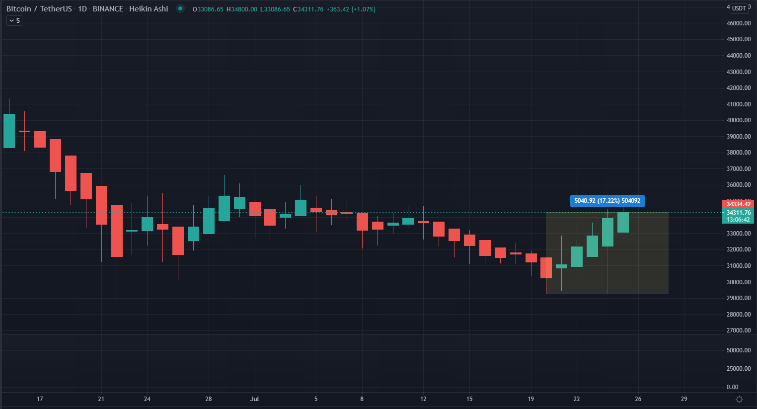Giá Bitcoin đã có sự hồi phục mạnh mẽ trong tuần trước. Tâm lý tiêu cực đã khiến giá Bitcoin giảm xuống dưới 30.000 đô la. Đây là mức hỗ trợ chính cho bitcoin. Mức này đã bị phá vỡ trong một thời gian ngắn vào tháng Bảy. Trong bảy ngày qua giá Bitcoin đã tăng 19.2% và vừa chạm mức cao nhất hàng tuần vào sáng nay tại $39,571.