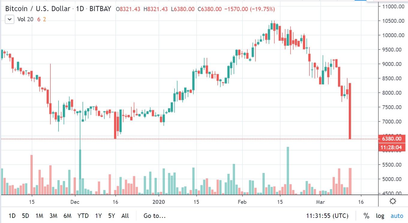 Ngày giao dịch hôm nay ghi nhận mức giảm thấp nhất kể từ tháng 12/2019. Giá Bitcoin vào lúc 6 giờ chiều nay (12/3) đã giảm đến mức 6.670 USD, còn cách một chút ít so với đáy 6.400 USD của ngày 16/2/2019.