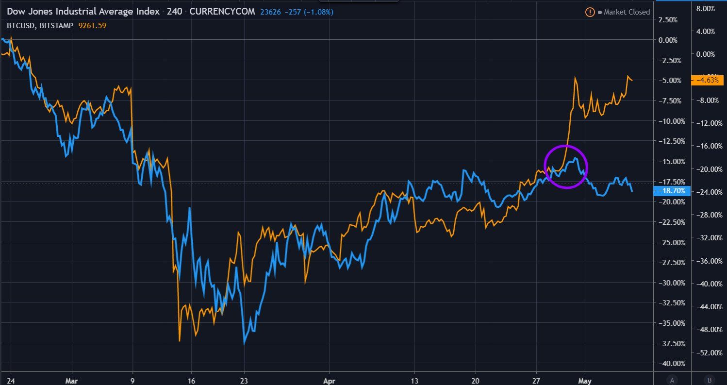 Giá Bitcoin đã bắt đầu tăng kể từ cuối tháng 4, trong khi Dow Jones tiếp tục chuyển động uể oải. Sự phân ly tương tự cũng có thể được nhìn thấy khi so sánh diễn biến giá của Bitcoin với S&P 500.