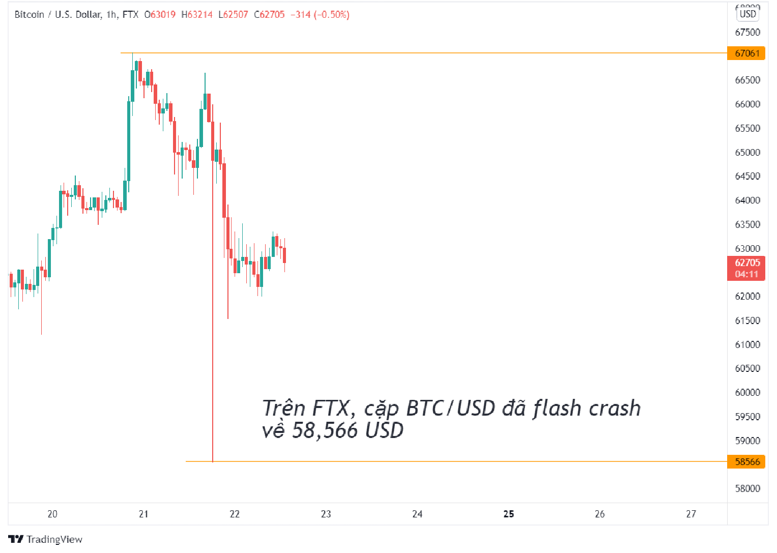 Trên sàn FTX, cặp BTC/USD đã xuất hiện râu nến 1H kéo dài từ 66,000 USD xuống tận 58,566 USD. Có nghĩa, giá BTC đã sụt giảm đến 11% chỉ trong 1h. Tuy nhiên, cũng chưa phải là biến động lớn nhất.