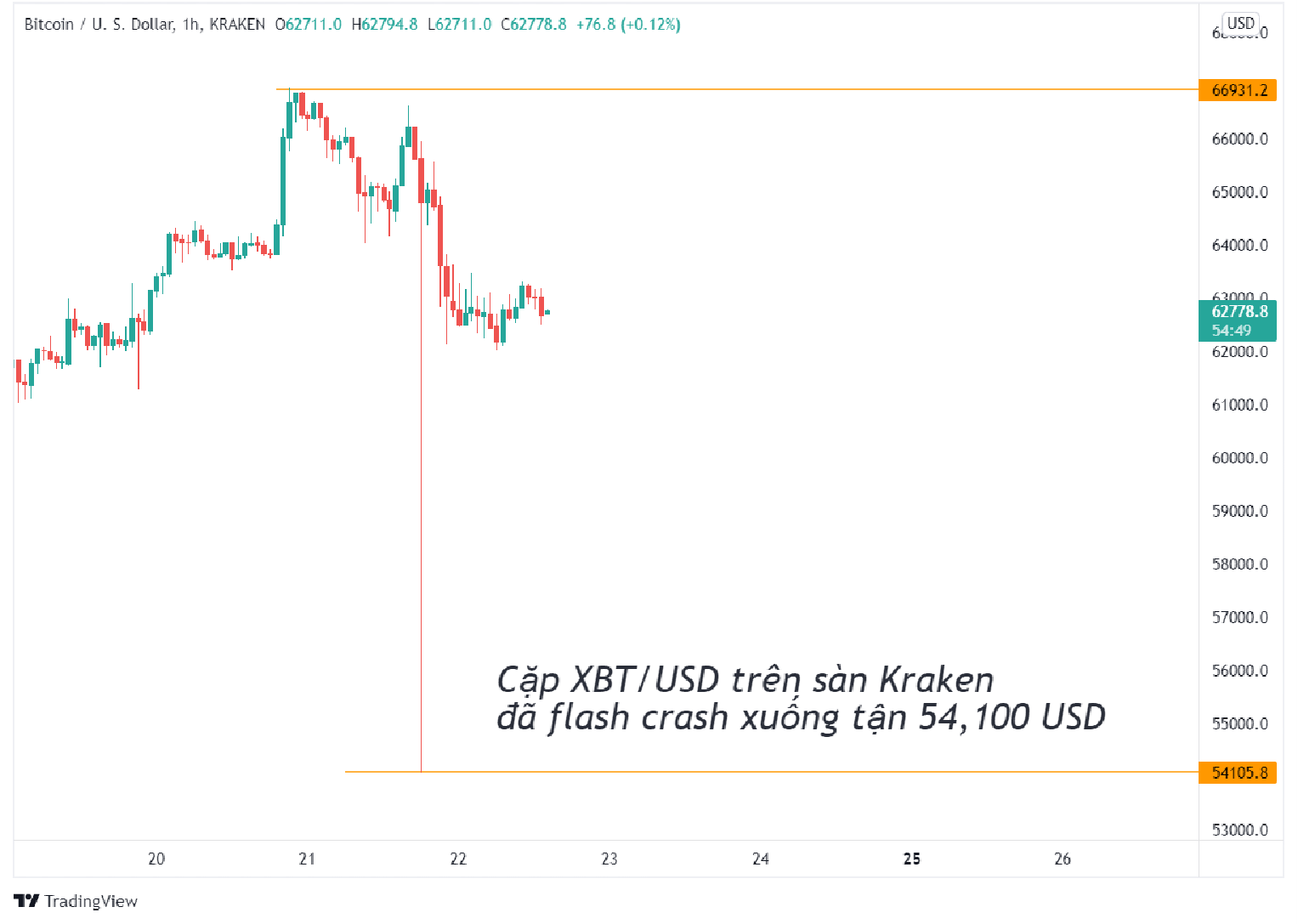 Hơn cả biến động trên FTX, cặp XBT/USD trên sàn Kraken đã có thời điểm sụt giảm từ 66,000 USD xuống tận 54,100 USD, tức sụt giảm gần 19% chỉ trong 1h. Nhưng đây vẫn chưa phải là biến động “đáng sợ” nhất nếu so sánh với Binance US.