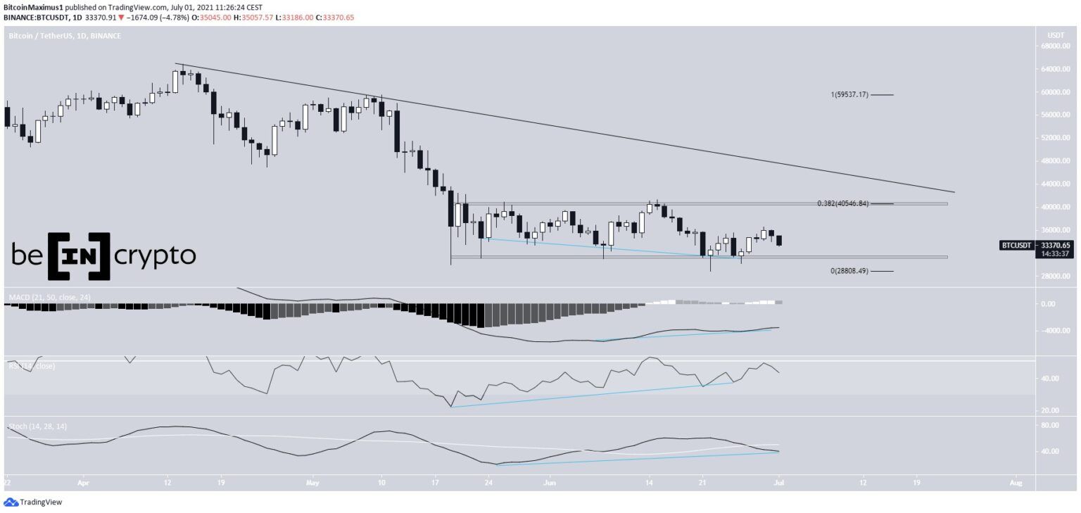 Kể từ ngày 19 tháng 5, giá BTC chỉ biến động trong vùng giá từ $40,500 đến $31,400. Vào ngày 22 tháng 6, giá BTC chạm mức thấp 28,805 đô la sau đó tăng mạnh trở lại.