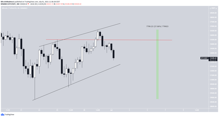 Ngoài ra, nếu đánh giá diễn biến giá trong 1 – 2 tuần qua thì lại thấy giá BTC đang giao dịch bên trong một nêm tăng dần. Đây được coi là mô hình giảm giá.