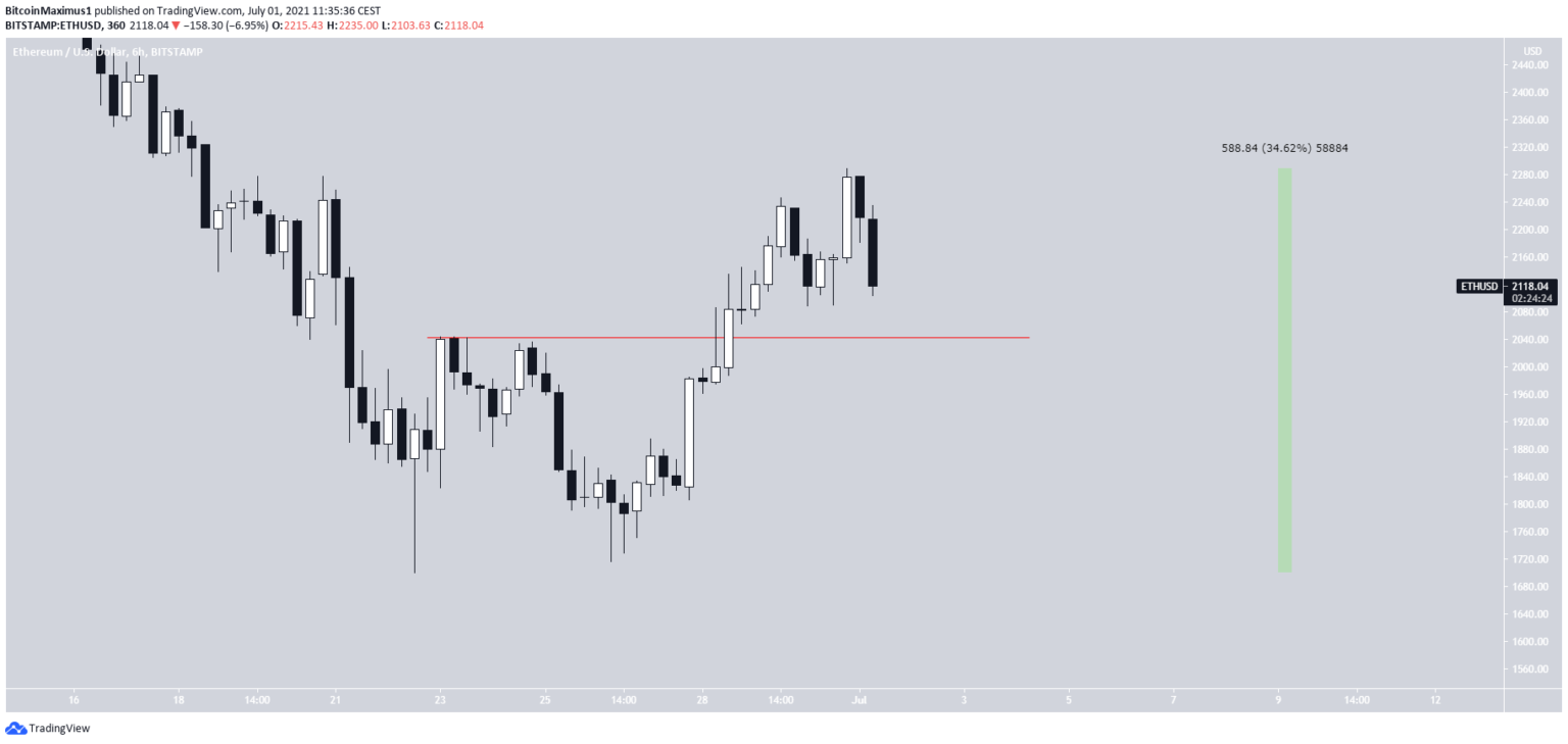 Tới nay, mức thấp nhất trong xu hướng giảm là 1,730 đô la vào ngày 23 tháng 5. Vào ngày 22 tháng 6, mô hình giá ETH đã tạo ra một mô hình hai đáy. Hai đáy gần như ở cùng một mức giá. Mô hình này được coi là mô hình tăng giá. Ngoài ra, trong chỉ báo MACD cũng đã tạo ra phân kỳ tăng.