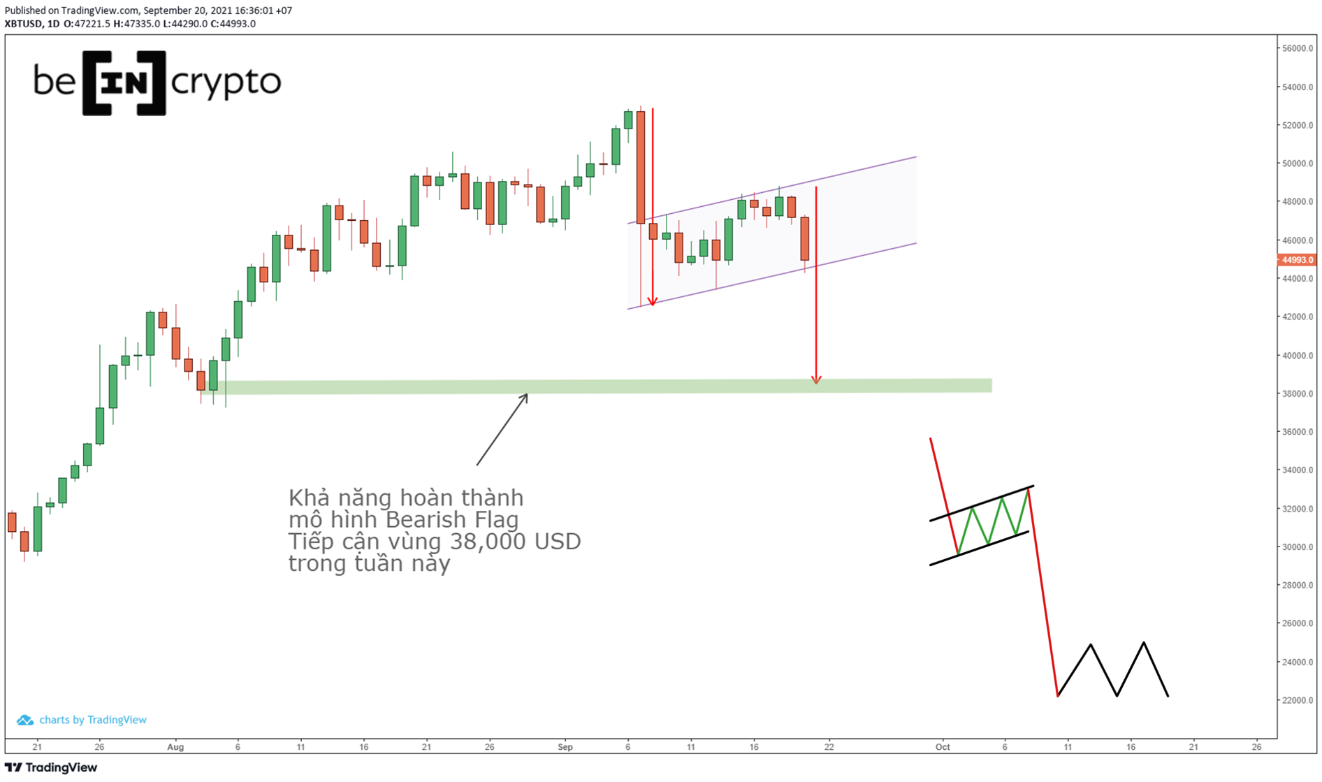 Thử quan sát biến động giá Bitcoin trong khung D1. Dự đoán mô hình giá cờ giảm (bearish flag).