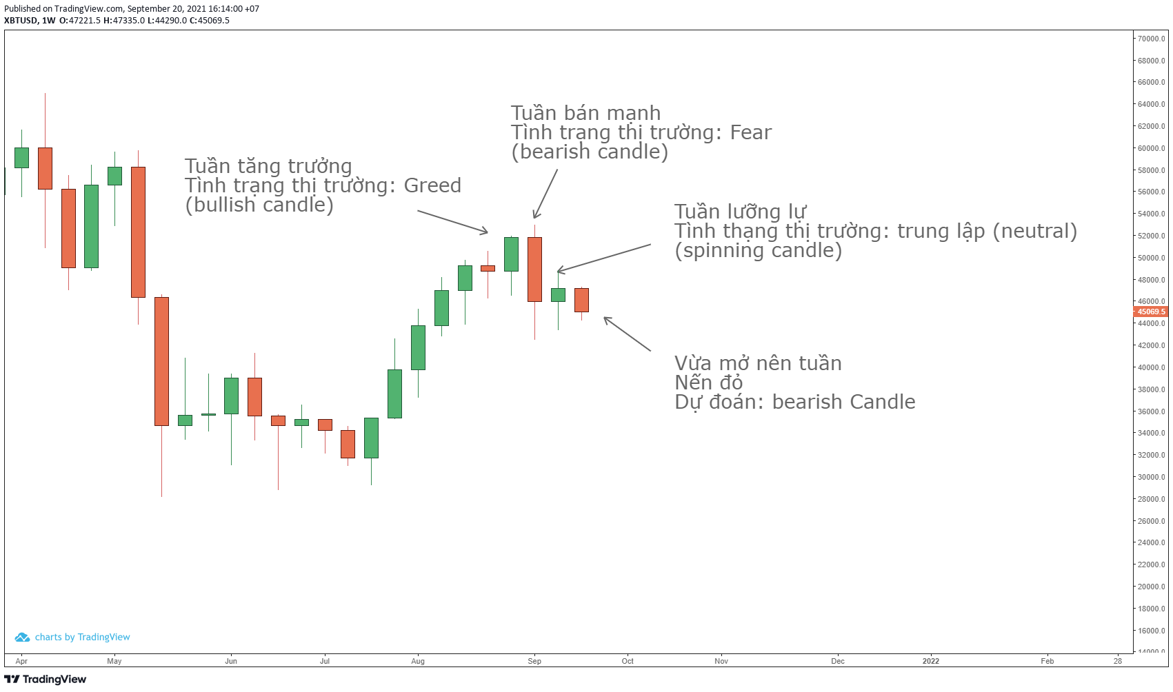 - Tuần đầu tháng 9, Bitcoin đột ngột bị bán mạnh dầu đang giữa lúc nhiều tin tức tốt. Tạo nên tình trạng “sợ hãi” tạm thời. Nến tuần này đã cho mức giá thấp nhất ở 42,900 USD. Phủ nhận nổ lực tăng giá của ba nến trước đó.