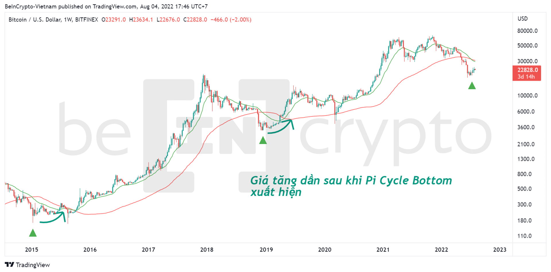 Pi Cycle Bottom không sử dụng để dự báo ngắn hạn nhưng được dùng trong khung ngày để dự báo một chu kỳ dài hạn. Và khi EMA150 giảm xuống dưới đường SMA471 thì Pi Cycle Bottom muốn nói rằng “đáy” của chu kỳ tăng mới đã xuất hiện.