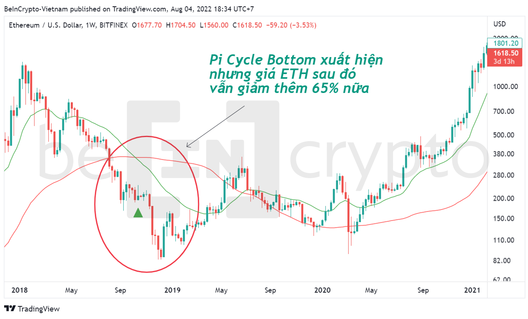 Năm 2019, Pi Cycle Bottom cũng xuất hiện với đường giá ETH. Giá ETH sau đó cũng cao hơn dần nhưng chỉ được vài tuần thì giảm thêm 65% nữa. Vậy thì, điều gì khiến cho kịch bản tương tự không xảy ra với Bitcoin hiện tại? Số lần thử sai với chỉ báo này quá ít ỏi để khẳng định mức độ đáng tin cậy.