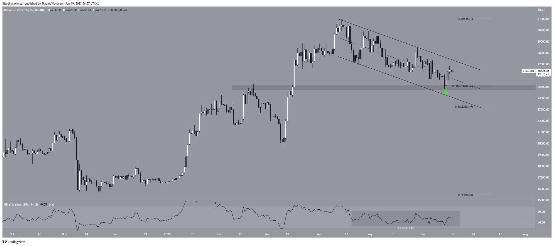 Vào ngày 15 tháng 6, giá BTC đã bật lên (biểu tượng màu xanh lục) tại điểm hợp lưu của các mức hỗ trợ ở mốc 25,000 USD. Khu vực này được tạo bởi mức hỗ trợ Fib thoái lui 0.382 và vùng hỗ trợ ngang. Do hợp lưu này, đây là một khu vực hỗ trợ quan trọng. Kể từ khi phục hồi, giá BTC đã di chuyển lên trên đường kháng cự của kênh.