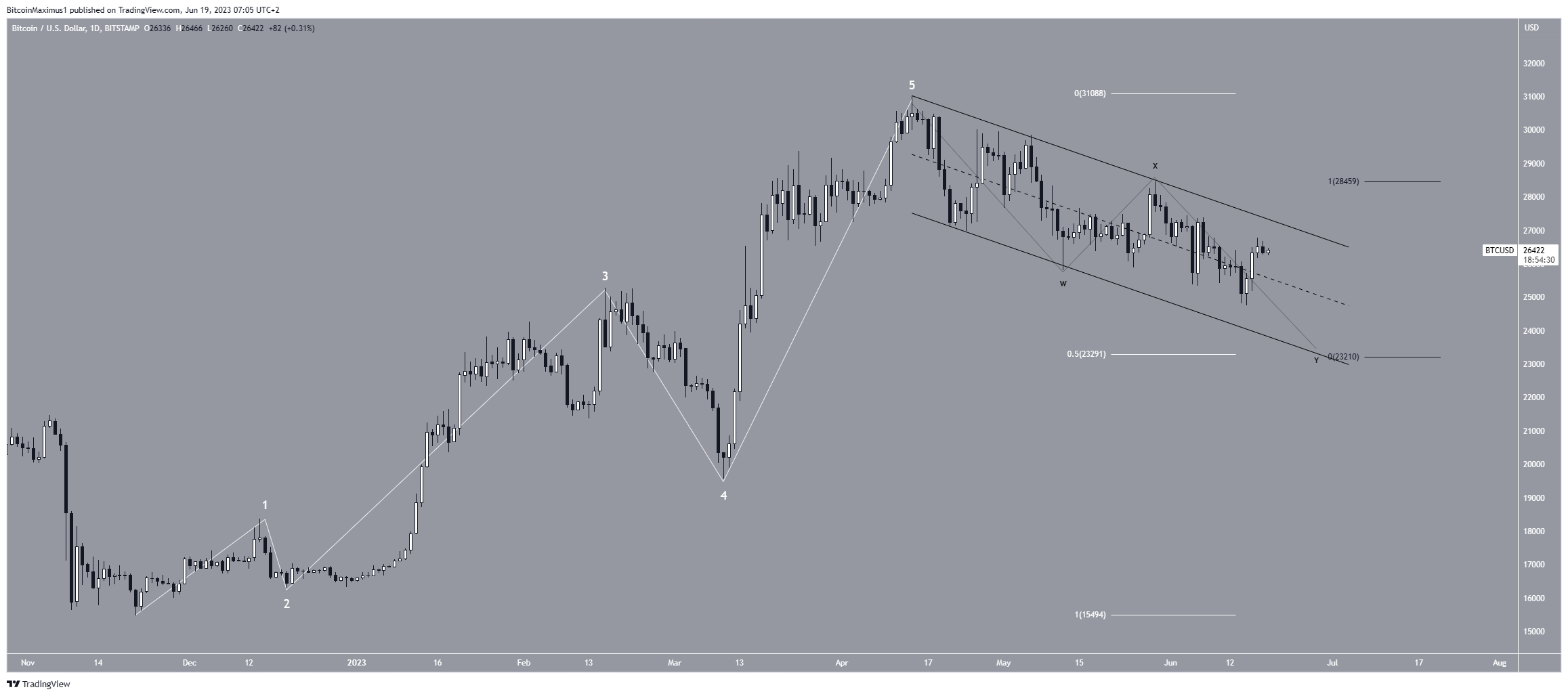 Dữ liệu cho thấy giá BTC đã được điều chỉnh theo cấu trúc điều chỉnh W-X-Y (màu đen) kể từ cuối tháng 5. Nếu đúng, giá BTC hiện đang ở sóng Y, đây là sóng cuối cùng trước khi đảo chiều tăng giá.