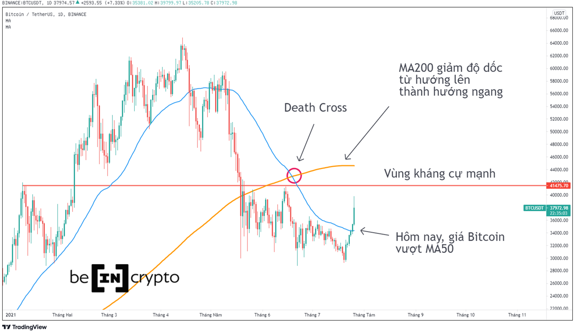 Theo dõi hệ thống giao dịch đơn giản và kinh điển giữa MA200 và MA50, thì giá Bitcoin hôm nay đã chính thức phá vỡ đường MA50.