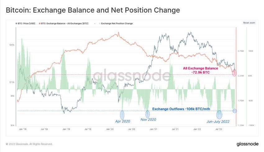 Dữ liệu từ Glassnode cho thấy sau sự sụp đổ của FTX, các nhà đầu tư Bitcoin đã rút tiền về ví tự lưu ký với số lượng lớn lên đến 106,000 BTC/tháng. Các trường hợp tương tự chỉ diễn ra 3 lần khác trong lịch sử của BTC là vào tháng 4/2020, tháng 11/2020 và tháng 6 – tháng 7/2022.
