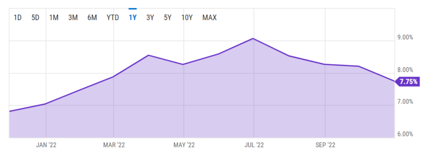 Chỉ số CPI tháng 10 tại Mỹ đã tăng lên 7.7% so với một năm trước. Đây là mức tăng hàng năm thấp nhất kể từ tháng 1/2022, giảm từ mức 8.2% so với tháng 9/2022. Chỉ số CPI cho phép Cục Dự trữ Liên bang Hoa Kỳ biết về số tiền người tiêu dùng trả cho hàng hóa và dịch vụ.