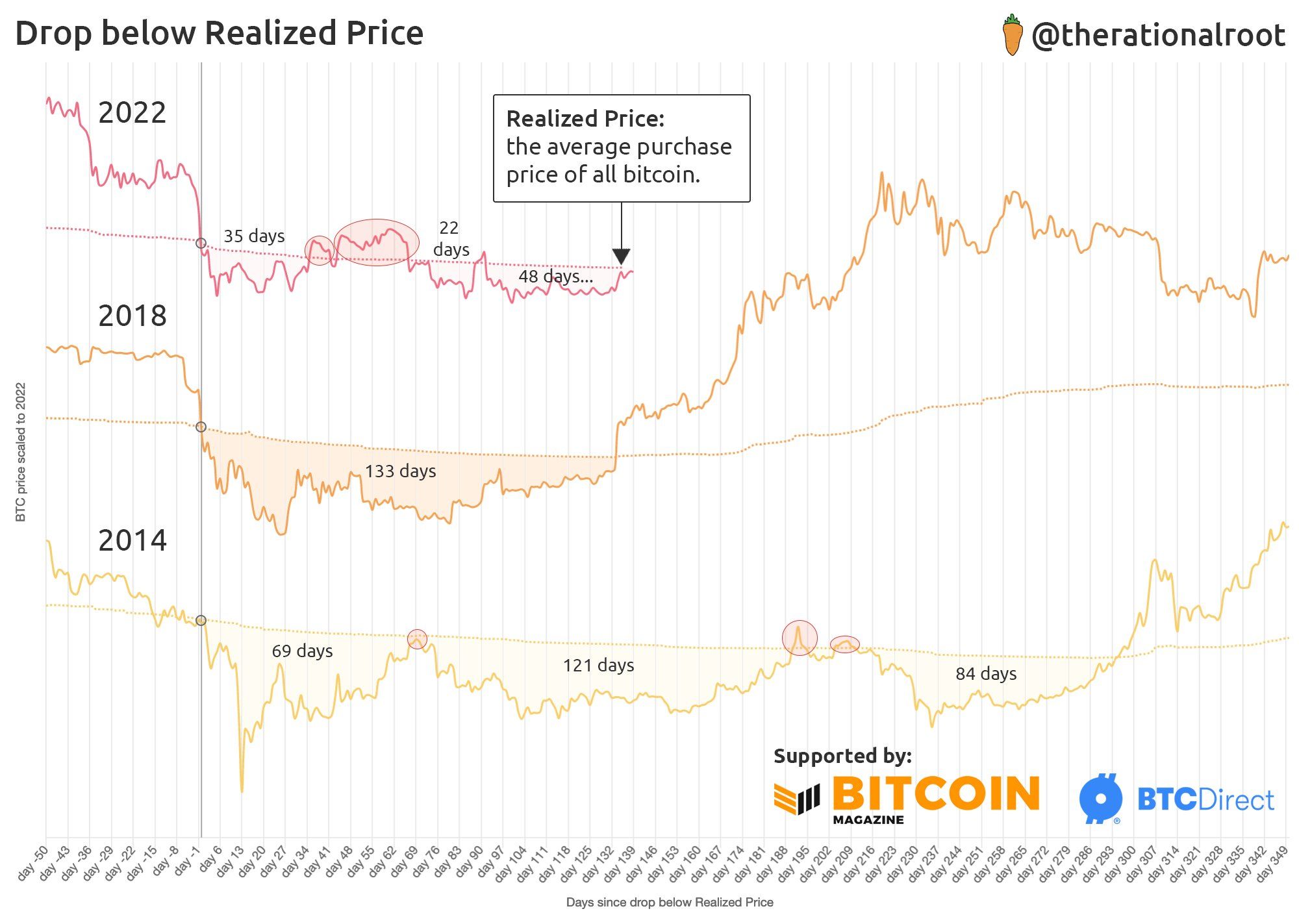- Đối với tín hiệu on-chain, Bitcoin sẽ phục hồi khi giá thị trường vượt giá hiện thực. Có thể nhìn thấy điều này trong năm 2018 và 2014. Trong đó, giá hiện thực được xem như là mức giá mua trung bình của tất cả Bitcoin.