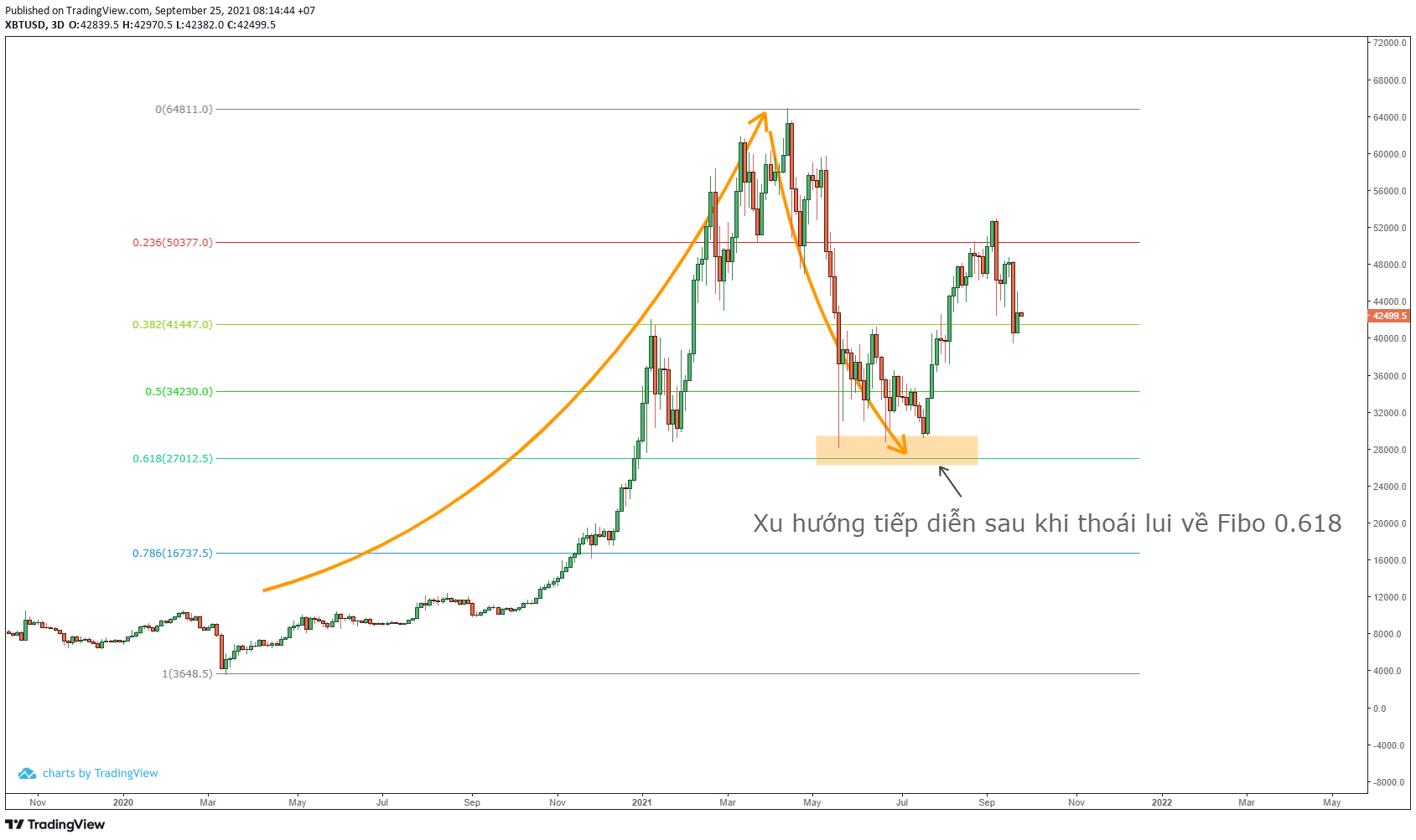 - Bạn hãy thử quan sát giá Bitcoin kể từ khi dịch COVID-19 bùng phát đến nay. Kể từ đỉnh 65,000 USD, giá Bitcoin phục hồi mạnh mẽ nhất là sau khi đạt đến vùng giá thoái lui theo tỷ lệ vàng. Tức là, vùng giá tại 29,000 USD.