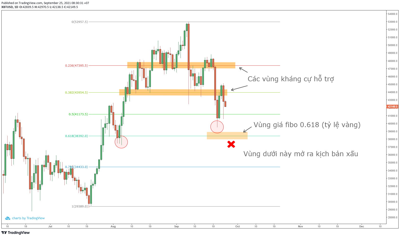 - Vùng thoái lui tỷ lệ vàng trong khung ngày là quanh mức 38,000 USD. Lần gần đây nhất, giá đã giảm về đến gần 39,000 USD. Nhưng giá đã phục hồi hai ngày sau đó. Tuy nhiên, sự phục hồi này vẫn chưa đủ mạnh mẽ. Lý do được đưa ra là Trung Quốc ban hành lệnh cấm, nên thị trường sụt giảm nghiêm trọng.
