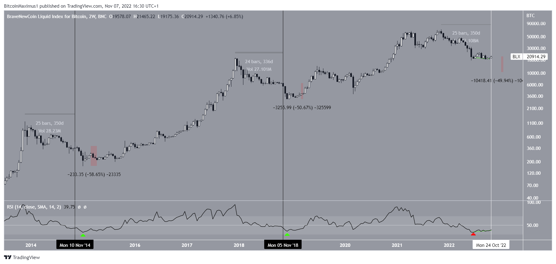 SponsoredTrong chu kỳ hiện tại, chỉ số RSI đã giảm xuống dưới mức 40. Mức đáy của RSI tháng 6/2022 (biểu tượng màu đỏ) là 34 là mức thấp nhất từng được ghi nhận. Hơn nữa, chỉ báo RSI đã bắt đầu tạo ra phân kỳ tăng (đường màu xanh lá cây). Đây là một dấu hiệu của sự đảo chiều tăng.