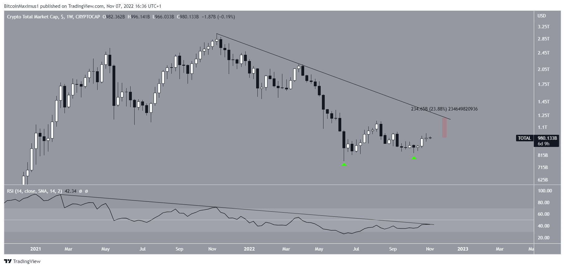 Vốn hóa thị trường tiền điện tử đưa ra một triển vọng tương giá đối lạc quan. Thứ nhất, nó cho thấy một đáy kép. Được coi là một mô hình tăng giá. Cả hai đáy đều có râu nến dài thấp hơn. Thứ hai, chỉ báo RSI tuần đã tạo ra sự phân kỳ tăng. Cuối cùng, chỉ báo RSI tuần đang trong quá trình thoát ra khỏi đường xu hướng phân kỳ giảm (màu đen).