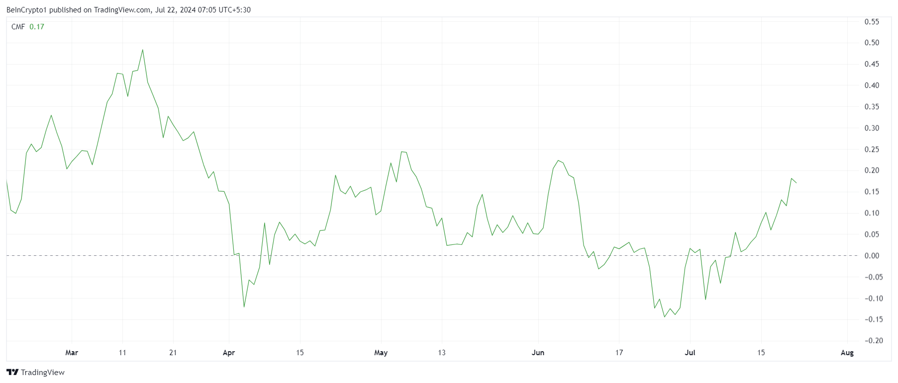 Bên cạnh RSI, dòng tiền Chaikin (CMF) cũng cho thấy những dấu hiệu khả quan cho BNB. CMF, đo lường dòng tiền vào và ra khỏi tài sản, đã có sự tăng lên, đạt mức cao nhất trong tháng, xác nhận rằng sự quan tâm đối với BNB đang tăng lên.