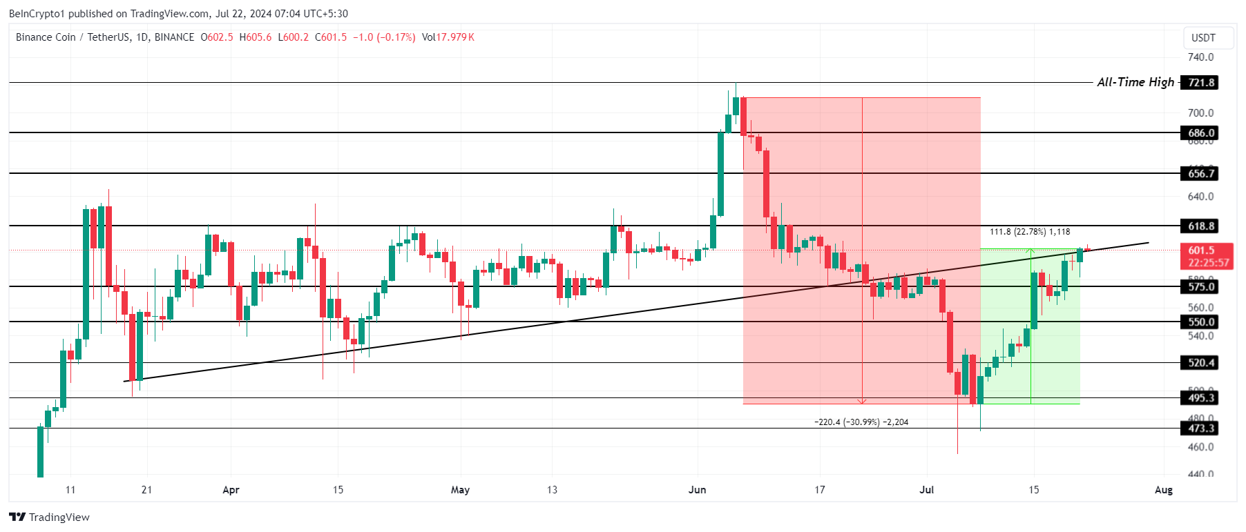 Giá BNB hiện đang giao dịch trên mức 600 USD lần đầu tiên trong hơn một tháng. Đợt tăng giá gần đây đã giúp token gốc của Binance đạt được mức giá này. Nhờ vậy, Altcoin này cũng gần như đã lấy lại được đường xu hướng tăng mà nó đã duy trì trong khoảng ba tháng trước khi mất nó như một mức hỗ trợ.