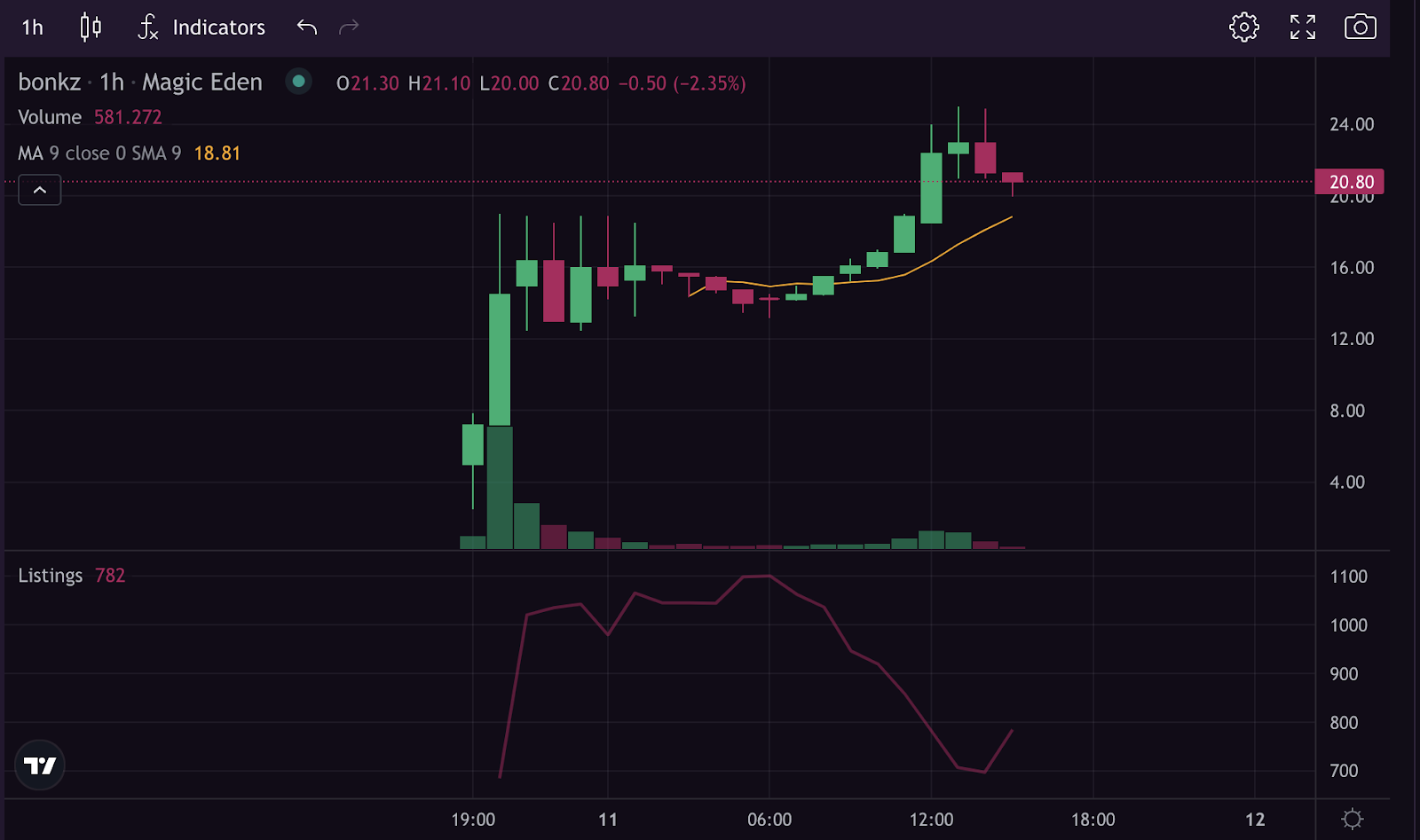 Theo dữ liệu từ Magic Eden, khối lượng giao dịch của bộ sưu tập NFT Bonkz là 124,900 SOL, xấp xỉ hơn 1.9 triệu USD. 771 NFT được niêm yết trên thị trường. 6,099 ví duy nhất sở hữu NFT Bonkz. NFT Bonkz đã gây ra một cơn sốt và cháy hàng ngay lập tức. Chúng được đúc với giá khoảng 25 USD và có giá sàn là 22.8 SOL, khoảng hơn 350 USD tại thời điểm BeInCrypto viết bài. Như vậy, mức giá bộ sưu tập NFT Bonkz này đã tương đương mức tăng giá gấp 14 lần trong vòng 24 giờ.