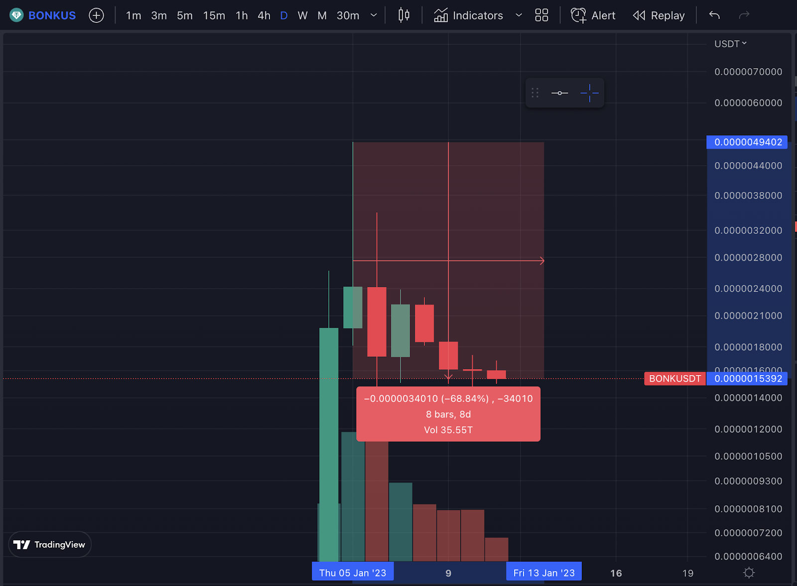 Việc bán NFT Bonkz không ảnh hưởng đến giá của token BONK. Theo đó, BONK đã đạt mức ATH vào ngày 05/1 tại khoảng 0.0000049499 USD và hiện đang giao dịch ở mức 0.0000015400 USD. Nó đã giảm gần 69% trong vòng 6 ngày sau khi đạt đỉnh.