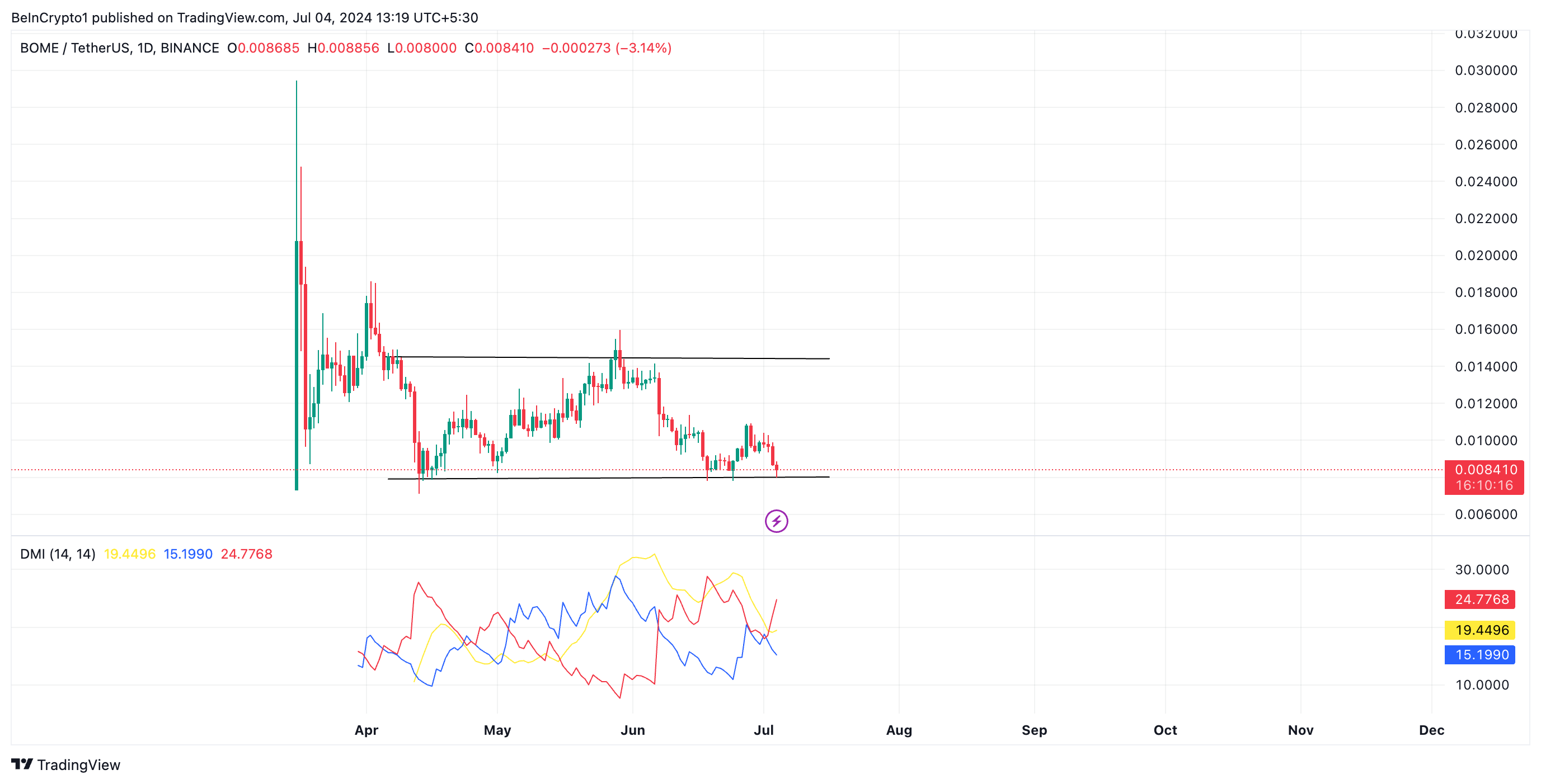 Đồng meme coin dựa trên Solana, Book of Meme (BOME), đã ổn định trong một phạm vi giá kể từ ngày 09/04, hình thành một kênh ngang.