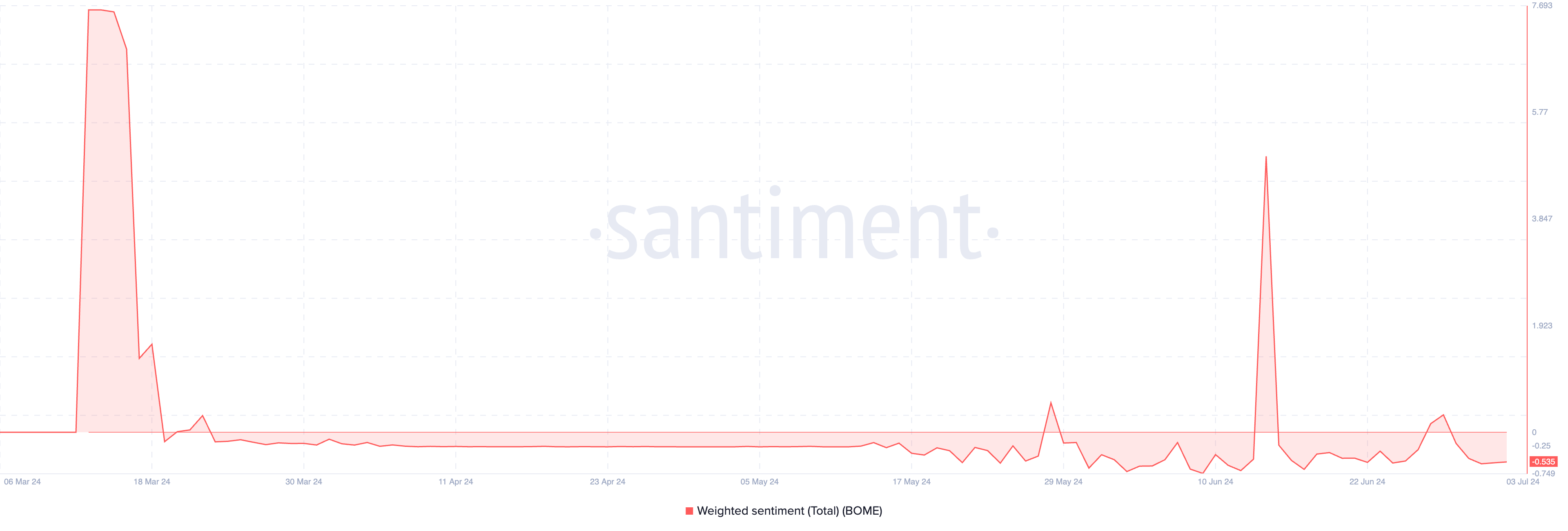 Các đề cập về BOME trên các nền tảng mạng xã hội hiện đang bị ảnh hưởng bởi cảm xúc tiêu cực. Điều này dựa trên các chỉ số weighted sentiment của nó, là -0.53 tại thời điểm viết bài.