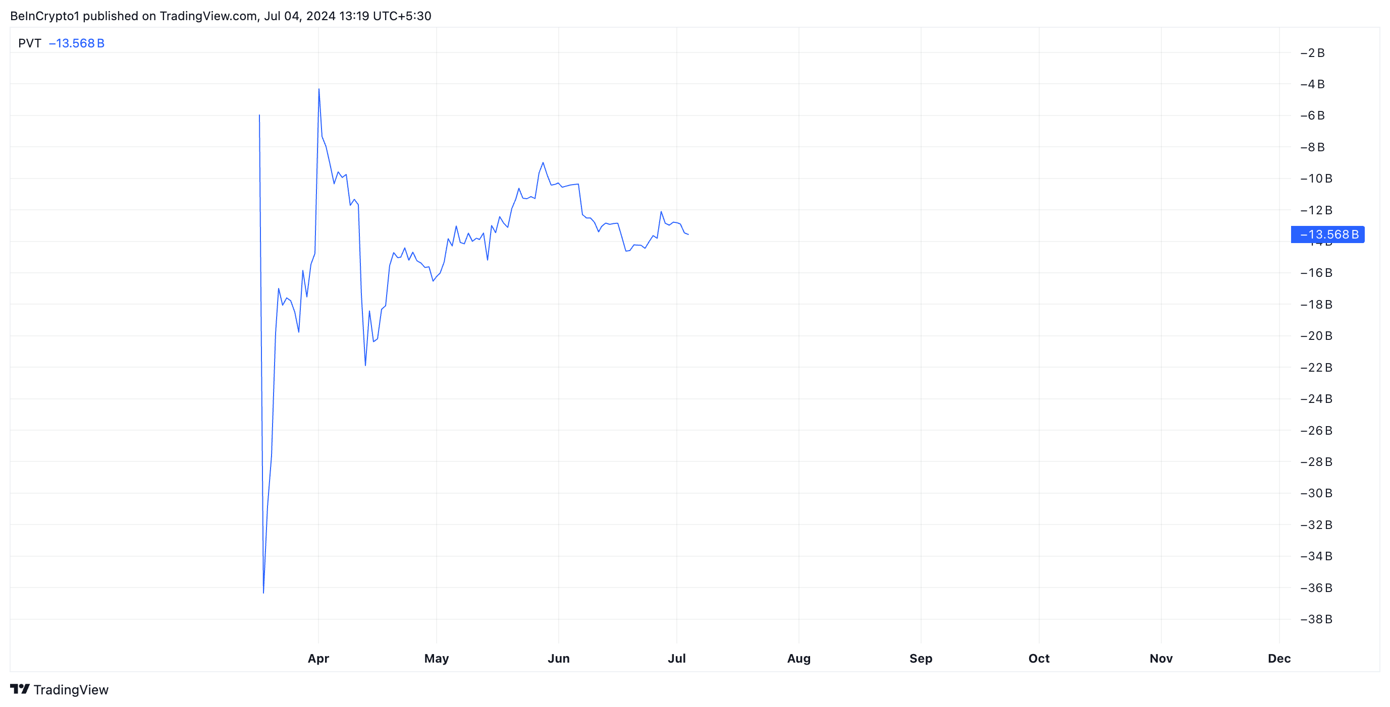 SponsoredChỉ số PVT của BOME bắt đầu giảm gần đây vào ngày 27/06 và kể từ đó đã có xu hướng giảm. Tại thời điểm viết bài, giá trị của chỉ số này là -13.57 tỷ.