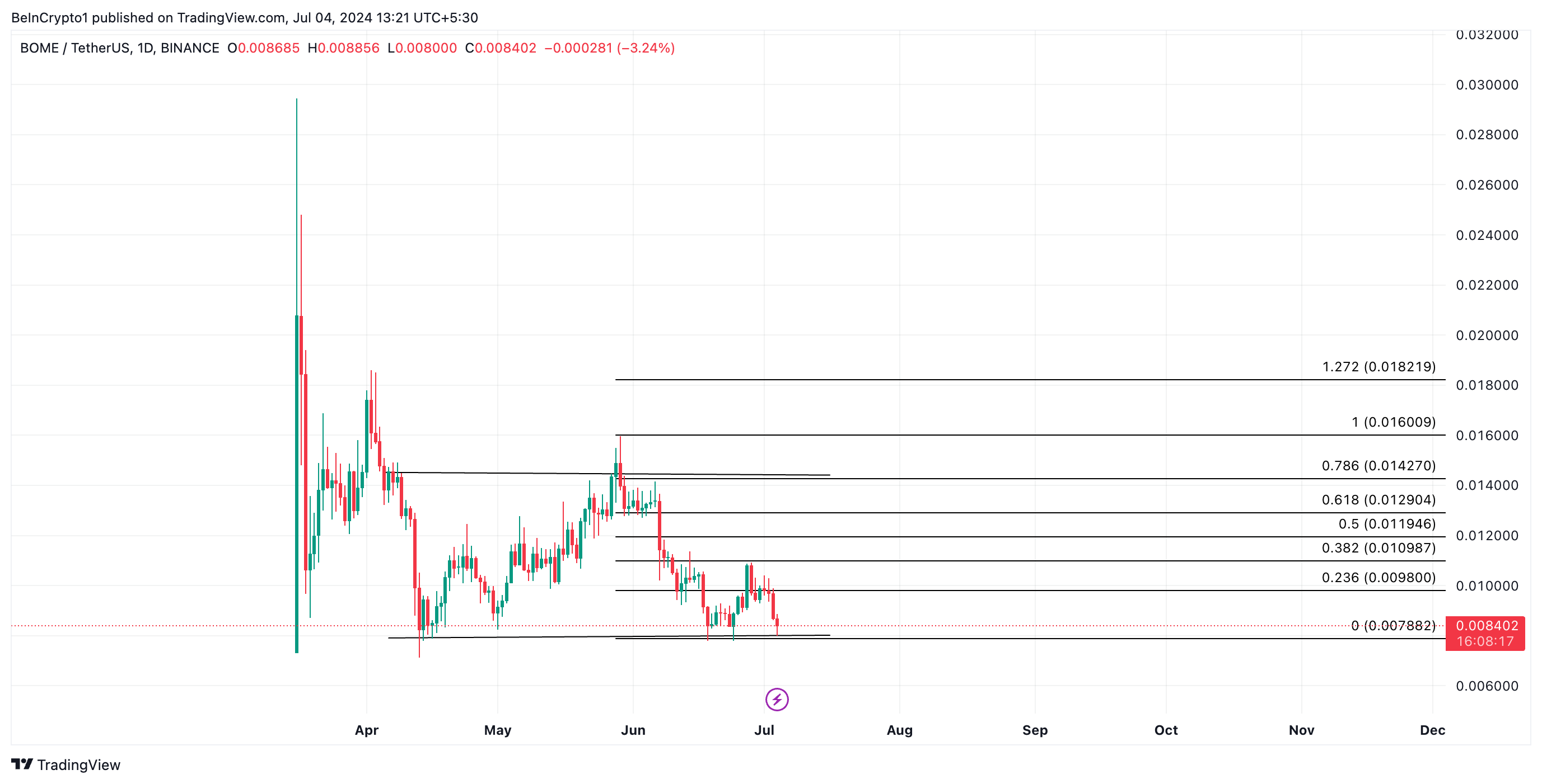 Tại thời điểm viết bài, đồng meme coin này đang được giao dịch ở mức 0.0084 USD, có khả năng sẽ giảm xuống dưới mức hỗ trợ quan trọng.